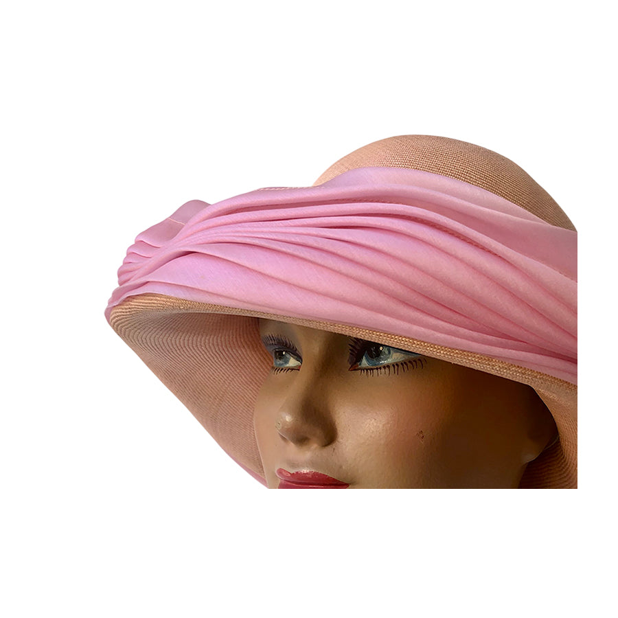 Cappello vintage ’50 cartwheel in paglia rosa pesca con ampia tesa strutturata e drappeggio in chiffon rosa cipria.