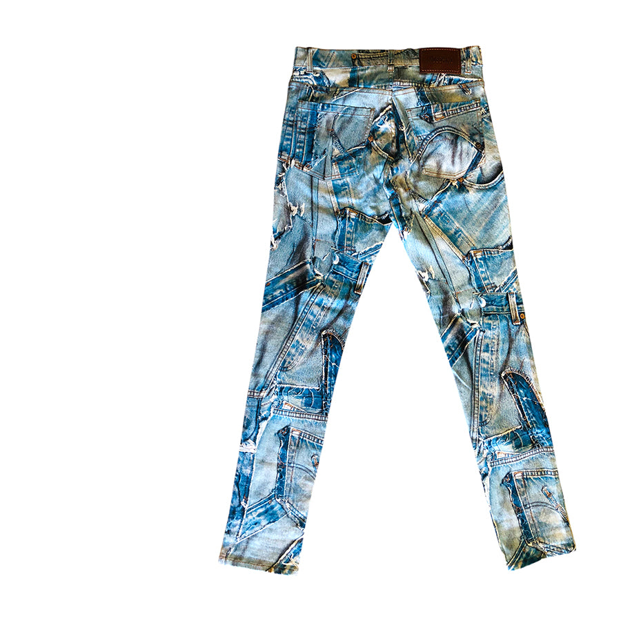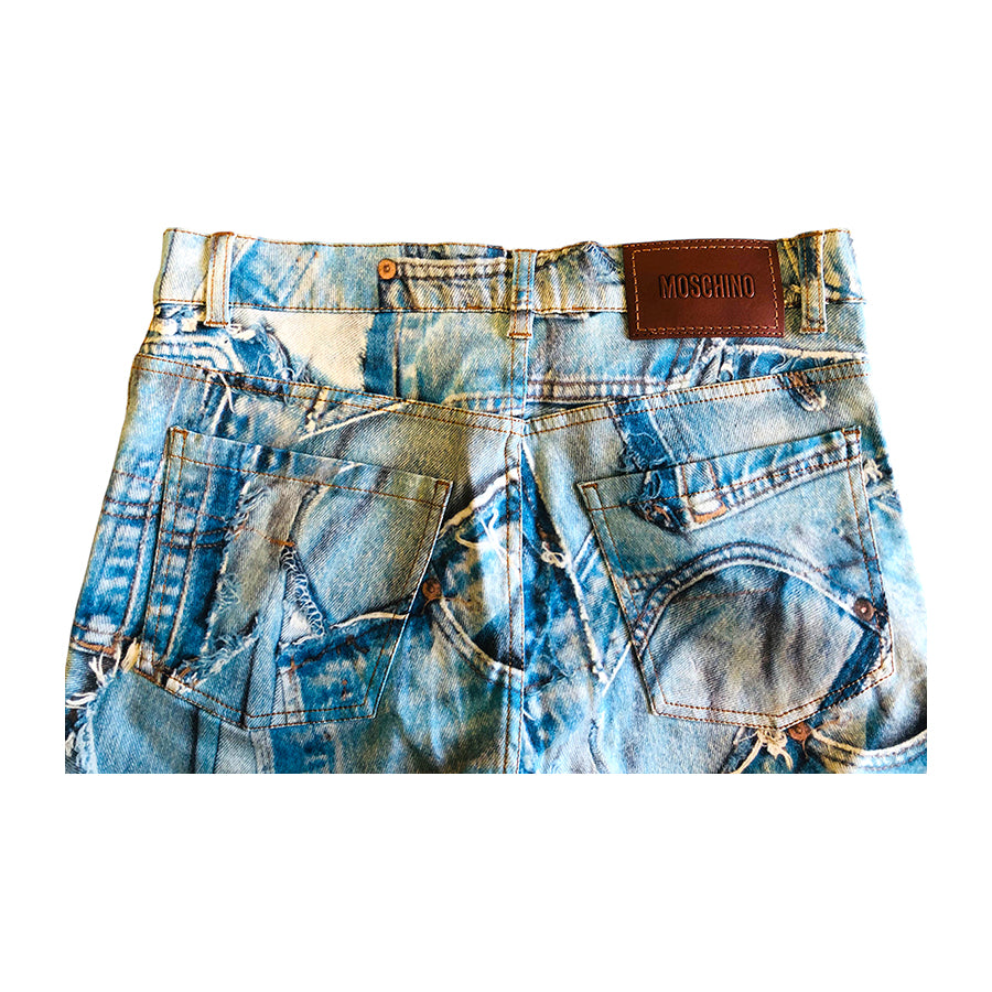 Jeans vintage Moschino Couture dal design trompe-l'œil effetto patchwork denim. Vestibilità slim, vita media e stampa all-over super creativa che trasforma un capo basic in una vera opera d’arte.