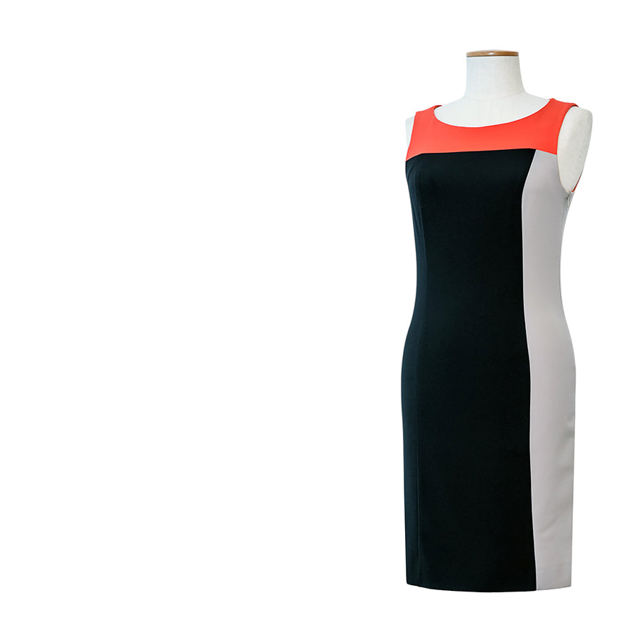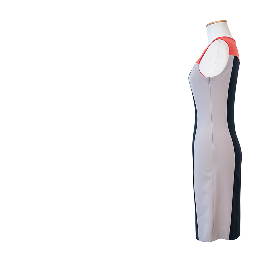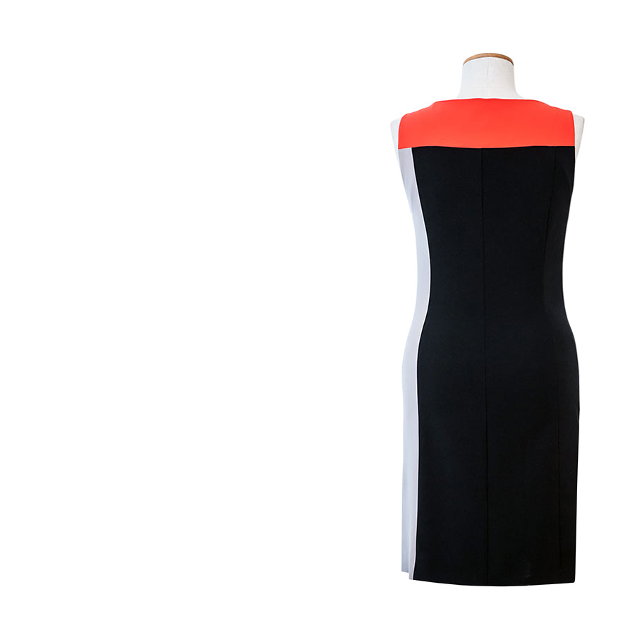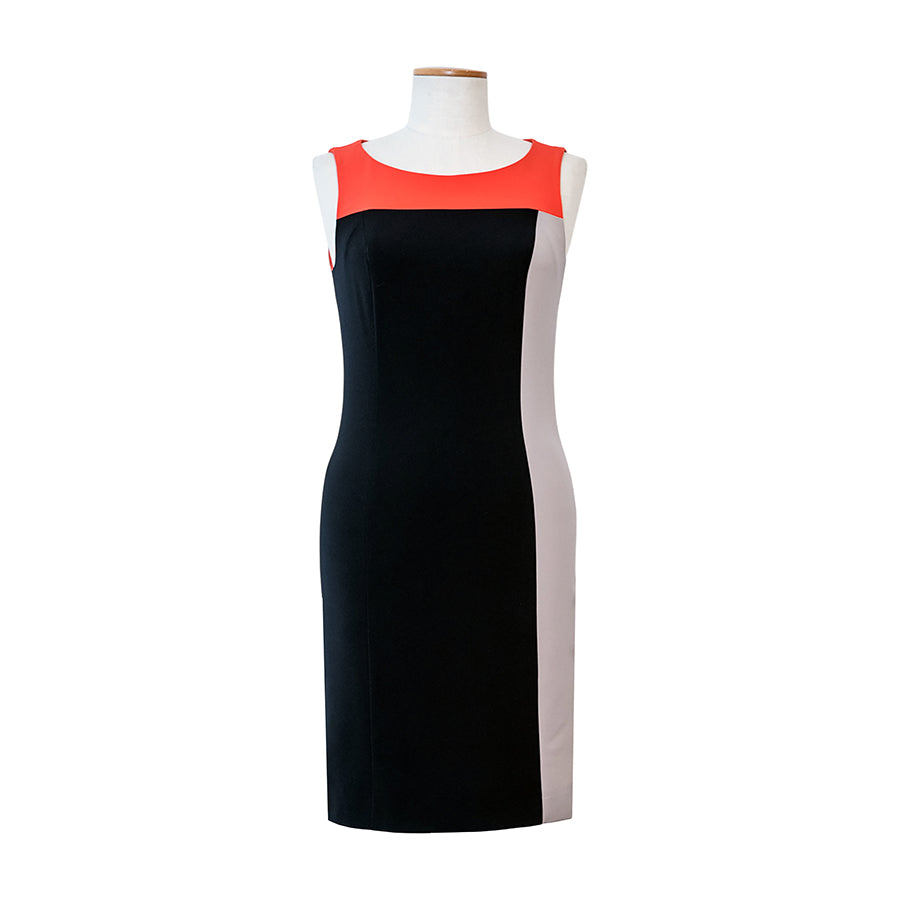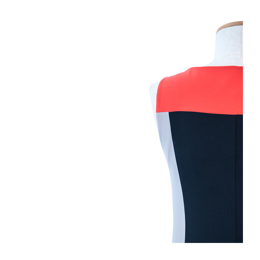 Tubino Pennyblack in poliestere ed elastan dal design color block nei toni del nero, tortora e rosso corallo. Il taglio senza maniche e la linea aderente mettono in risalto la silhouette, mentre il tessuto elasticizzato garantisce una vestibilità impeccabile.