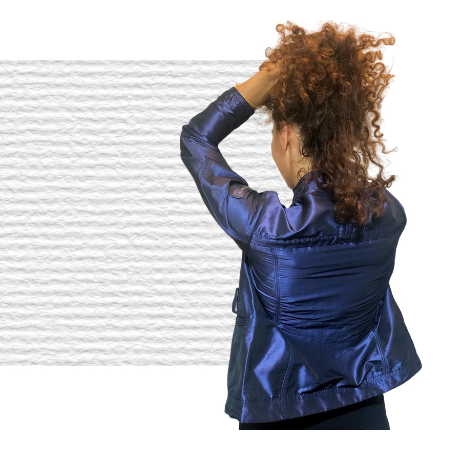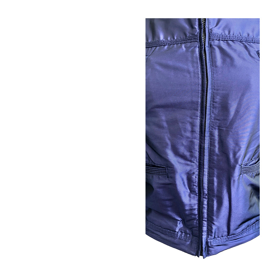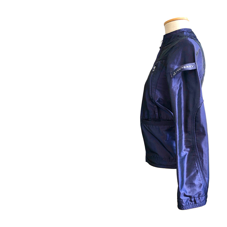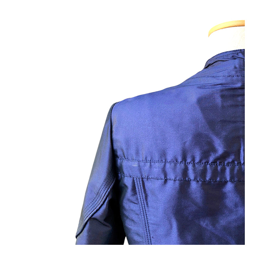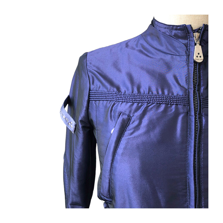 Giacca biker Peuterey di colore blu china in tessuto tecnico. Il design minimalista caratterizzato da una chiusura frontale con zip, collo in stile biker e cuciture orizzontali che strutturano il busto. Le maniche lunghe, aderenti e lisce contribuiscono a creare una silhouette affusolata e sofisticata.