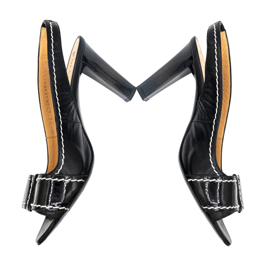 Slingback vintage firmate Pollini in pelle nera e vernice lucida con cuciture bianche a contrasto. Cinturino aperto sul tallone, fiocco squadrato e tacco largo.