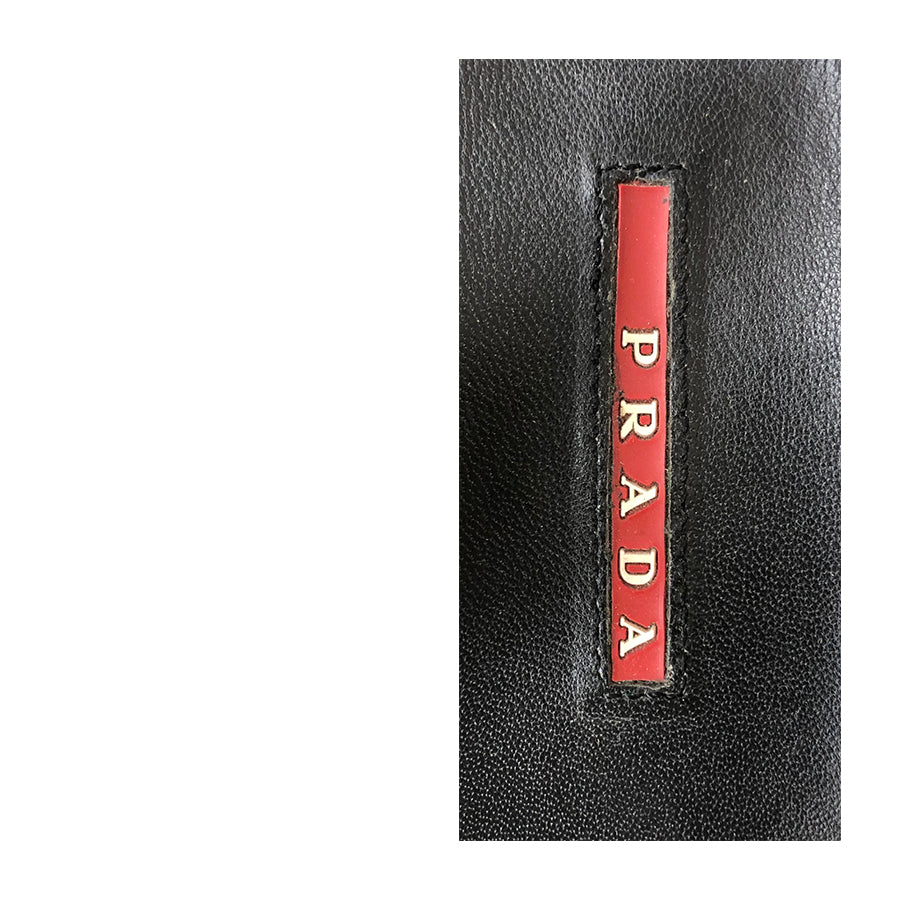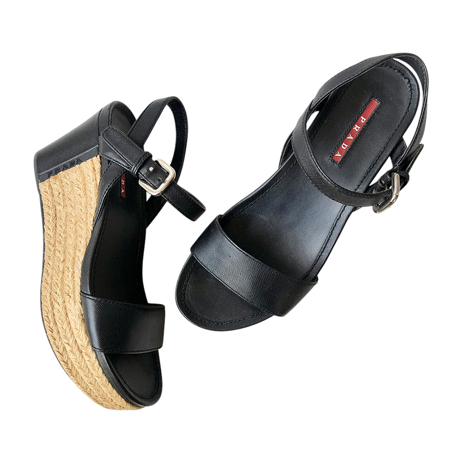 Sandali platform Prada in pelle nera con zeppa in corda intrecciata e dettaglio logo laterale inciso. Suola ergonomica e cinturino regolabile con fibbia metallica. Sono prive di numero leggibile ma corrispondenti a 38 IT in base alle misure indicate.