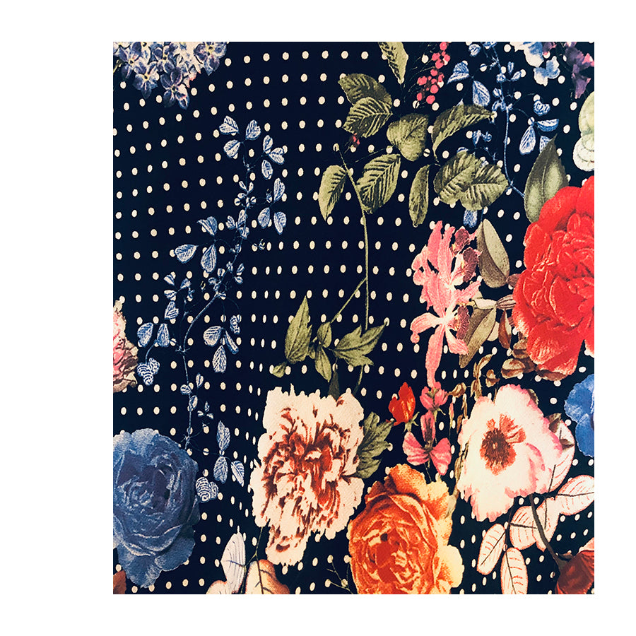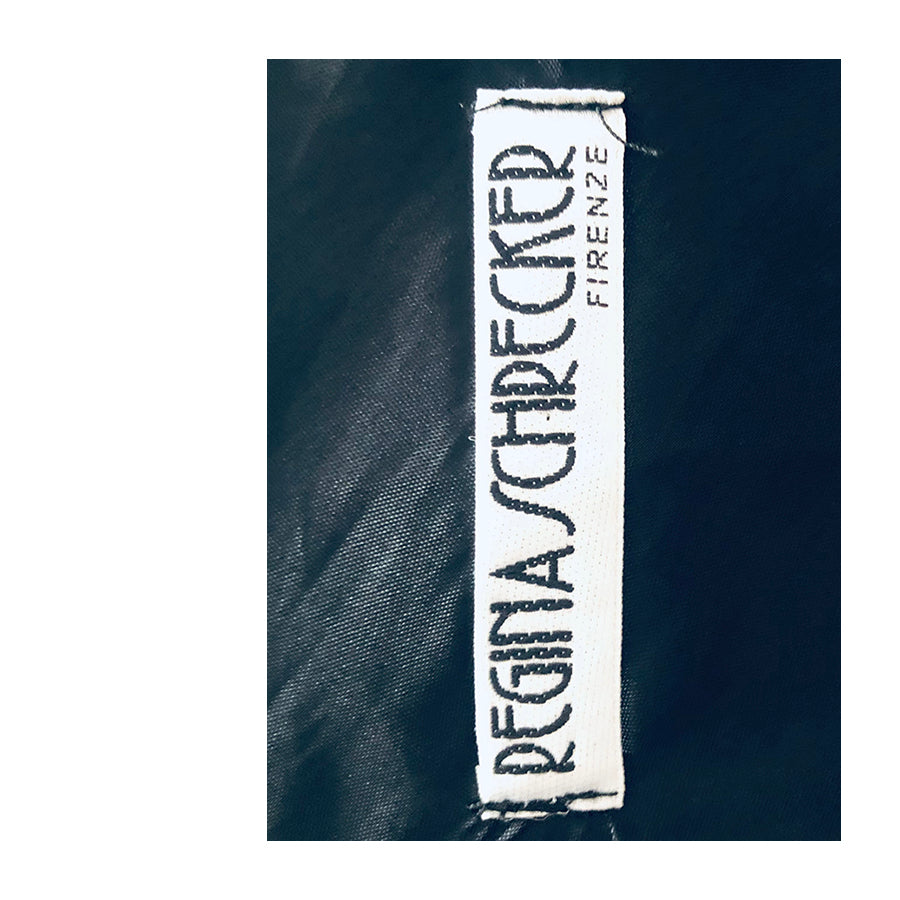 Top oversize vintage ‘90 Regina Schrecker in chiffon con fantasia floreale multicolore su base nera a pois bianchi. Modello senza maniche con scollo rotondo, taglio morbido con volant a strati.