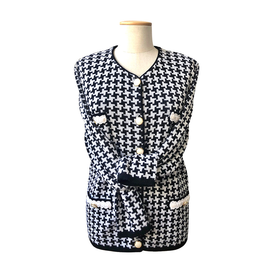Cardigan vintage Renato Balestra in lana e cashmere con macro pied-de-poule nei toni del bianco e nero. I bottoni dorati e le finiture in passamaneria bianca lo rendono estremamente versatile. Taglia comoda o oversize.