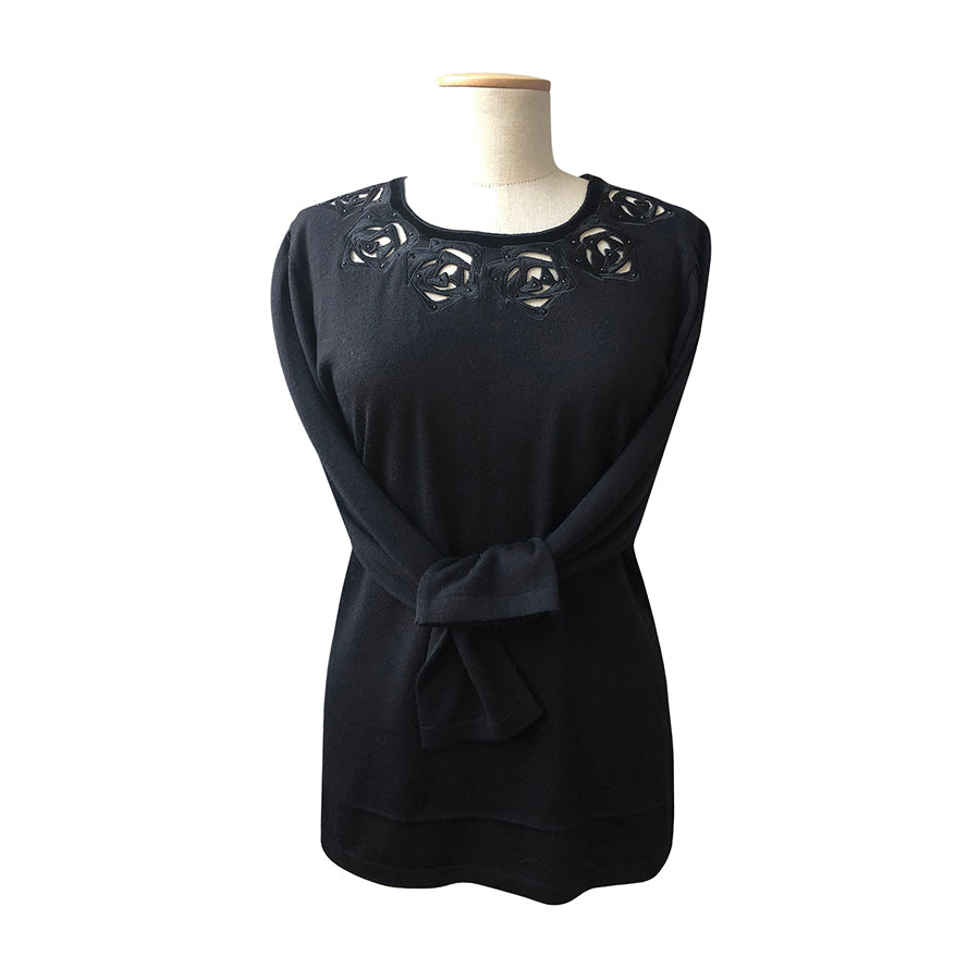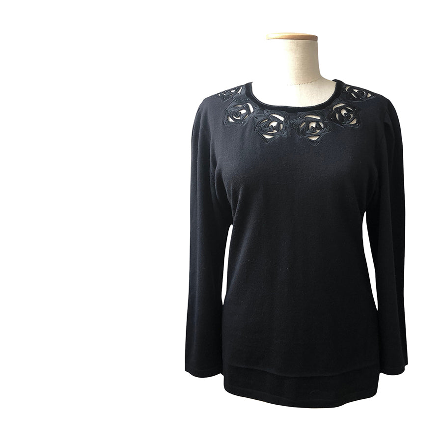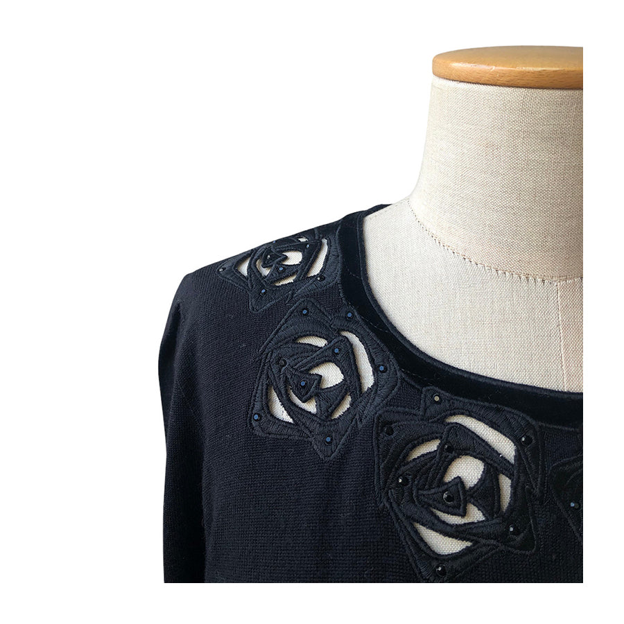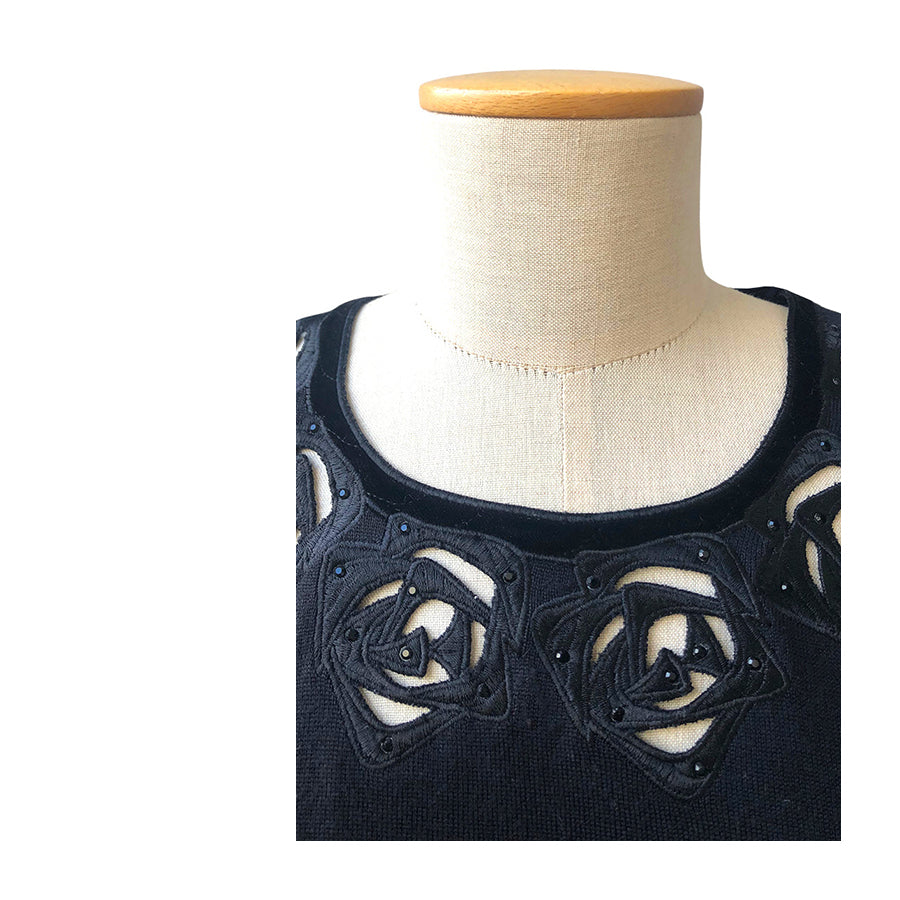 Pull vintage Renato Balestra in lana con dettagli traforati e applicazioni floreali sullo scollo arricchiti da piccole perline tono su tono. La linea classica con maniche lunghe e vestibilità morbida assicura comfort e versatilità.
