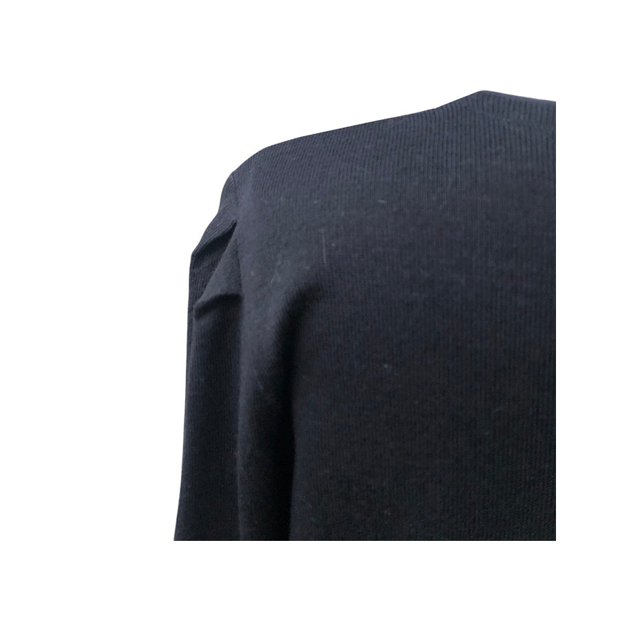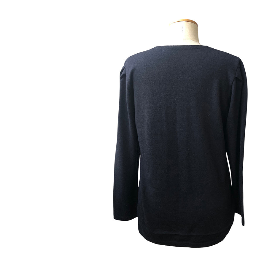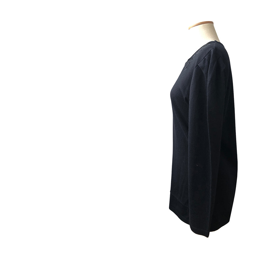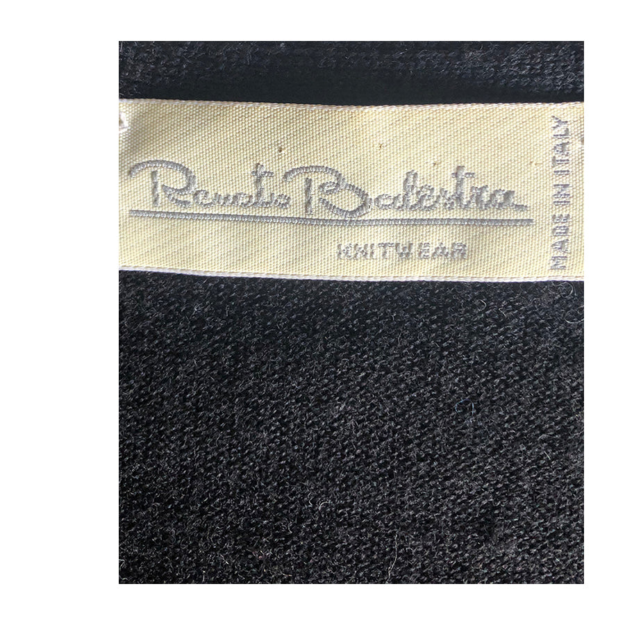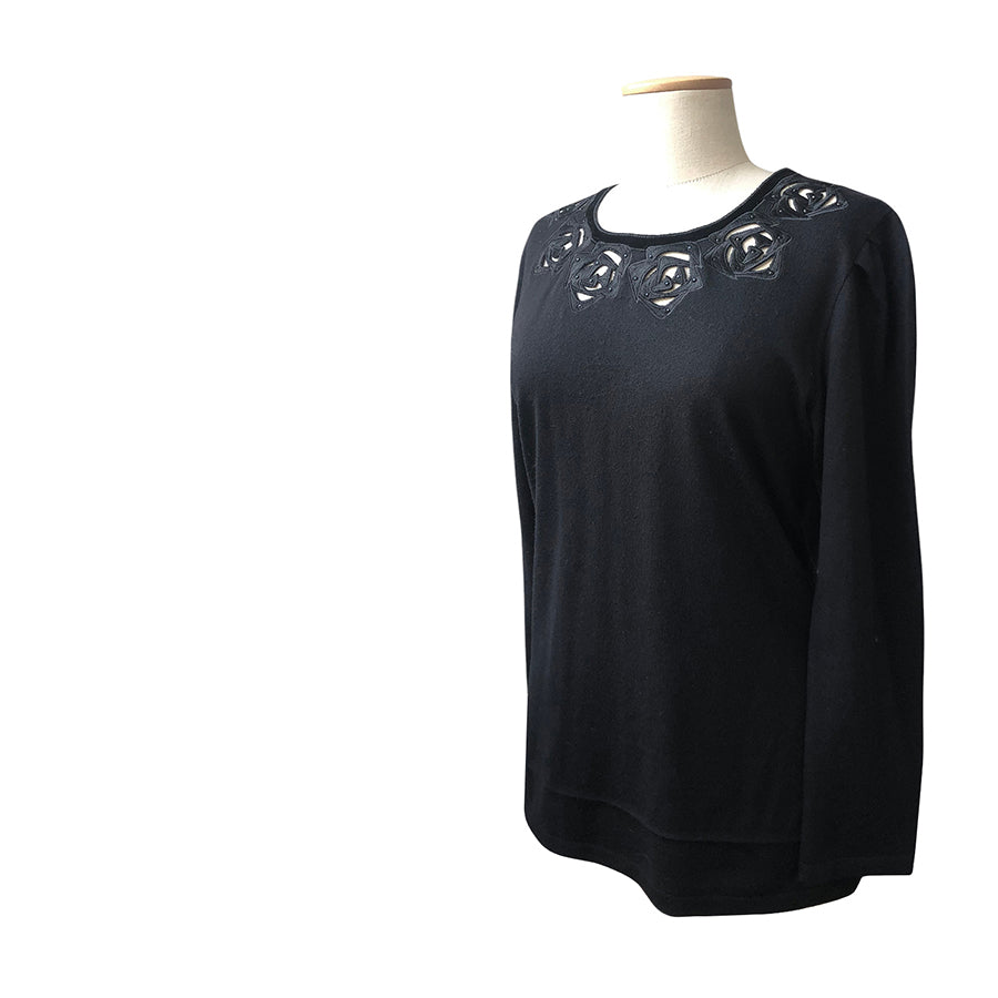 Pull vintage Renato Balestra in lana con dettagli traforati e applicazioni floreali sullo scollo arricchiti da piccole perline tono su tono. La linea classica con maniche lunghe e vestibilità morbida assicura comfort e versatilità.