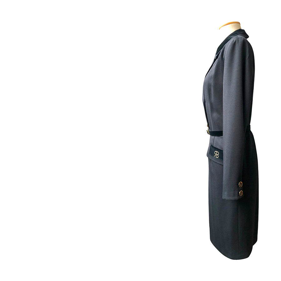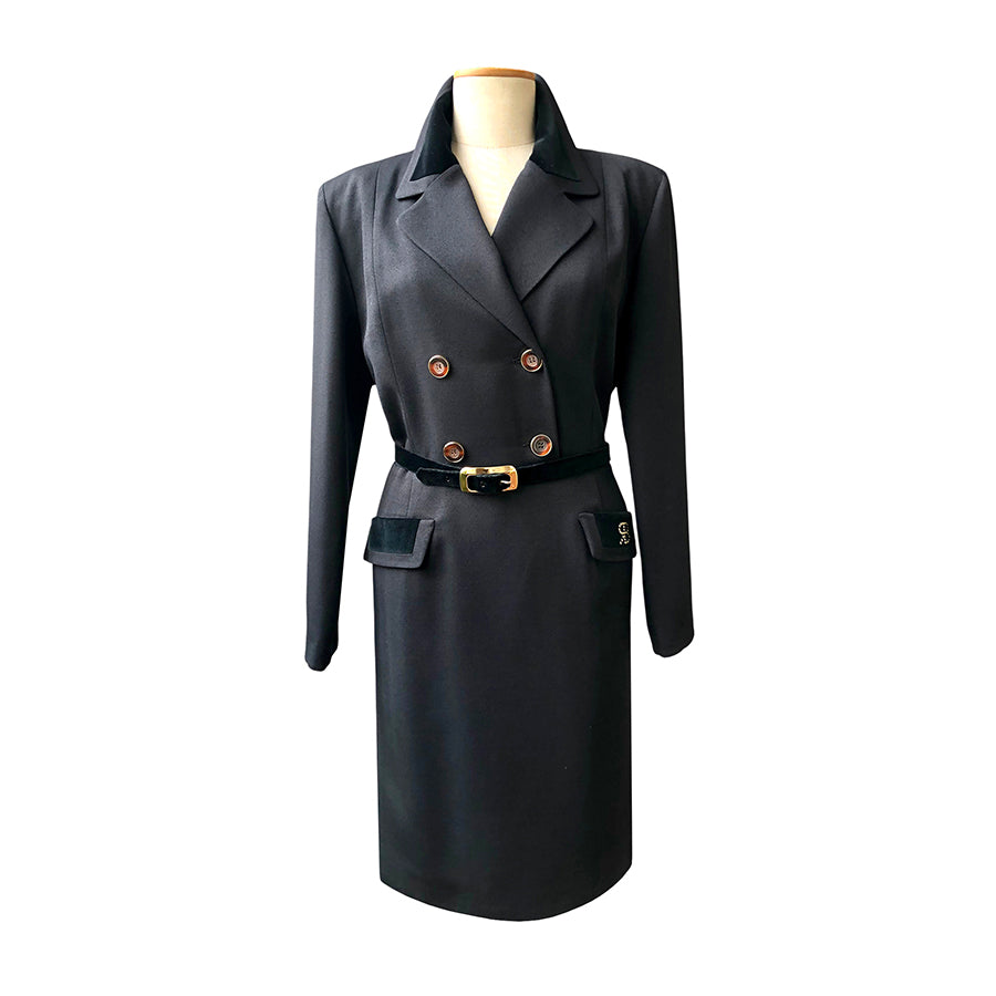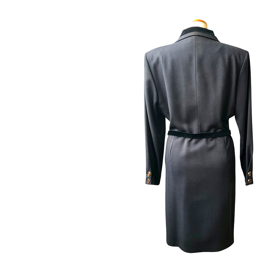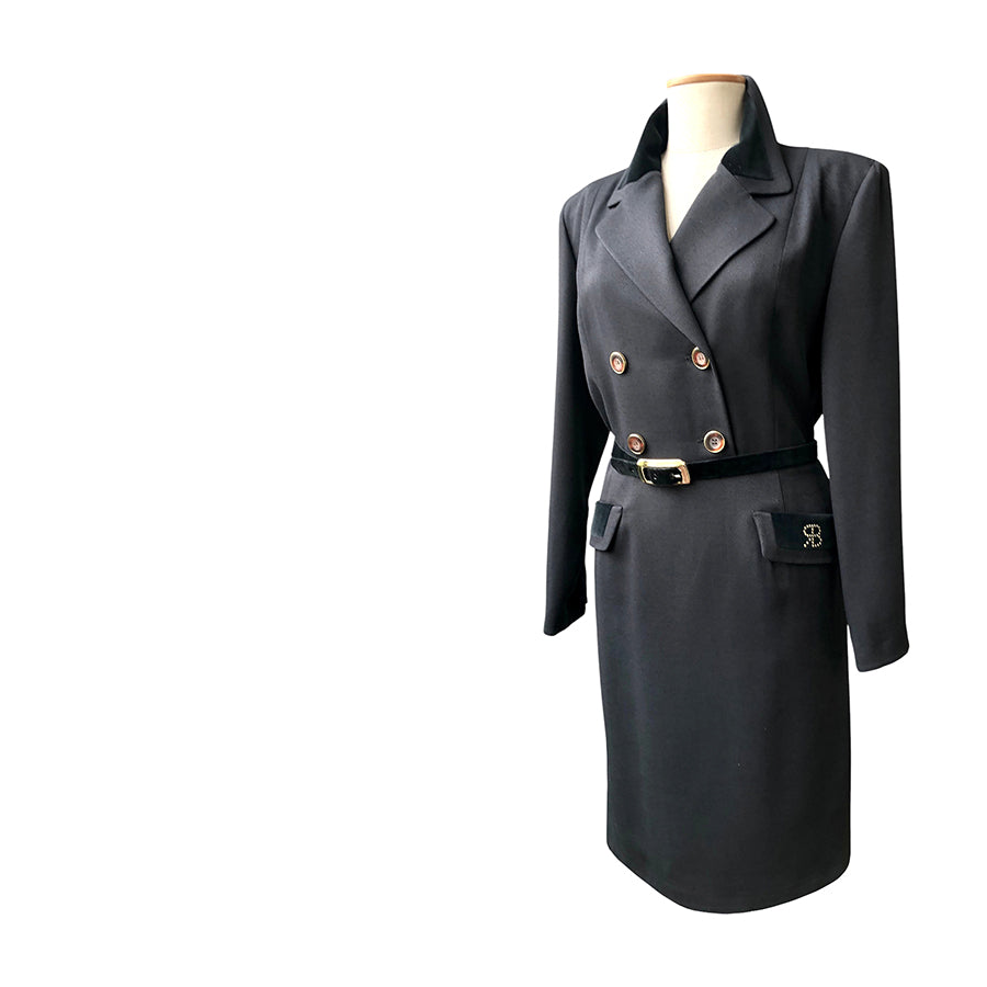 Redingote vintage ’80 Renato Balestra degli anni ’80. Linea strutturata doppiopetto, bottoni dorati, colletto a contrasto in velluto nero e cintura in velluto con fibbia dorata.