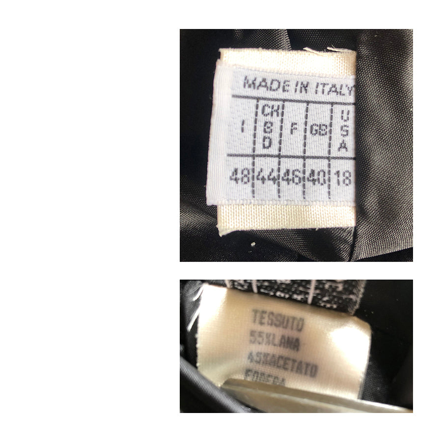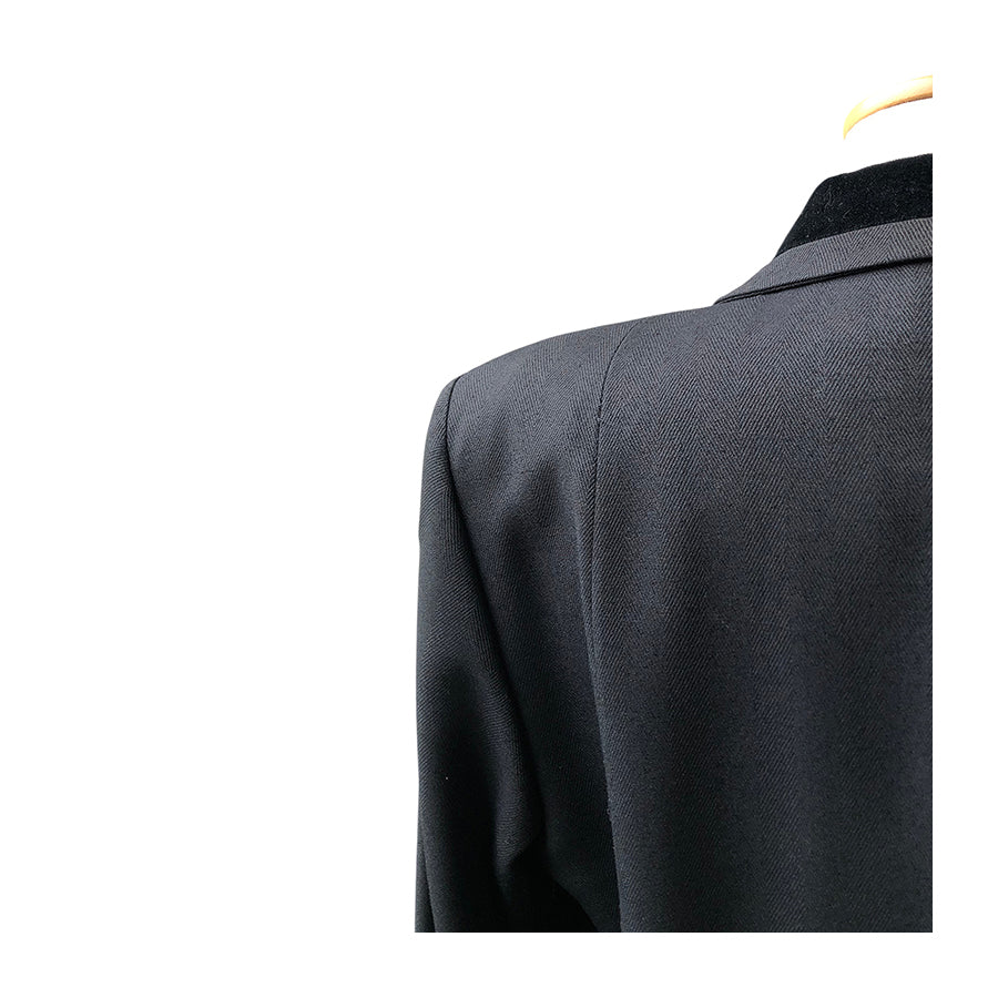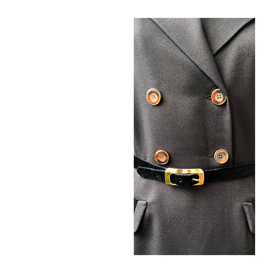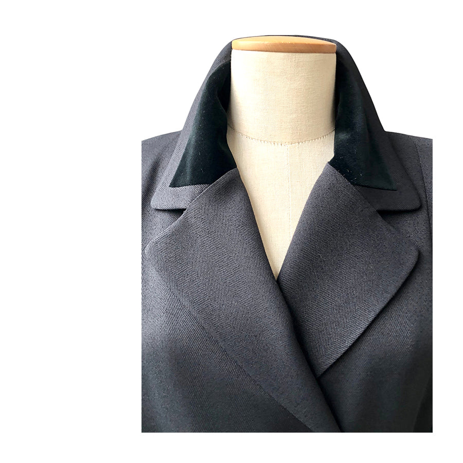 Redingote vintage ’80 Renato Balestra degli anni ’80. Linea strutturata doppiopetto, bottoni dorati, colletto a contrasto in velluto nero e cintura in velluto con fibbia dorata.