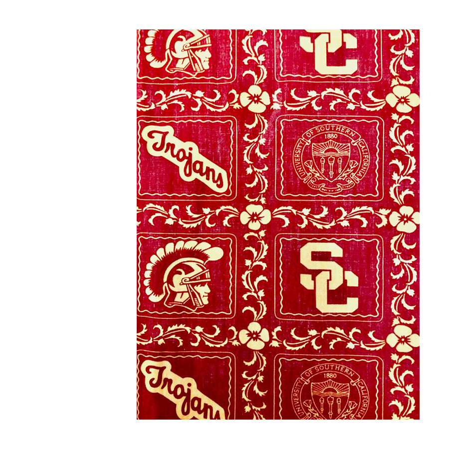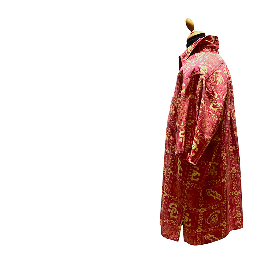 Aloha shirt vintage firmata Reyn Spooner, con stampa USC Trojans in rosso acceso e dettagli giallo oro in stile patchwork. Realizzata in cotone a trama reversed tipico del brand