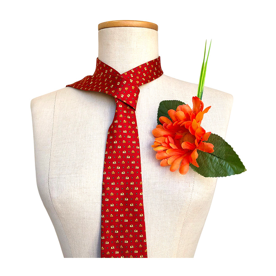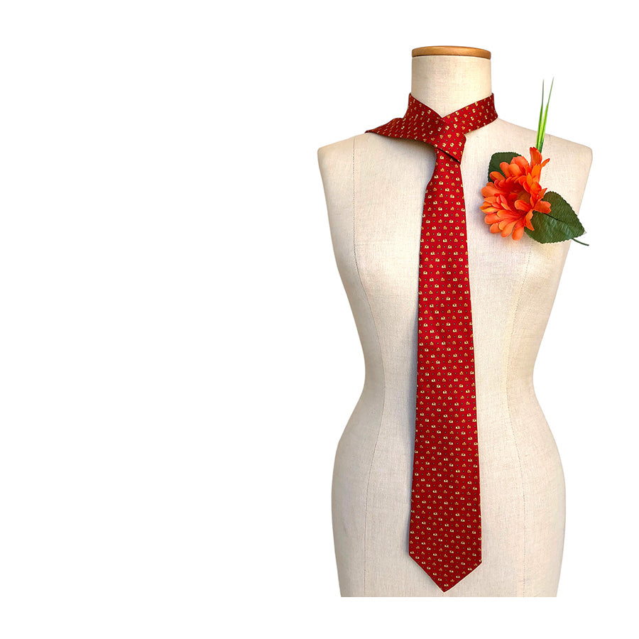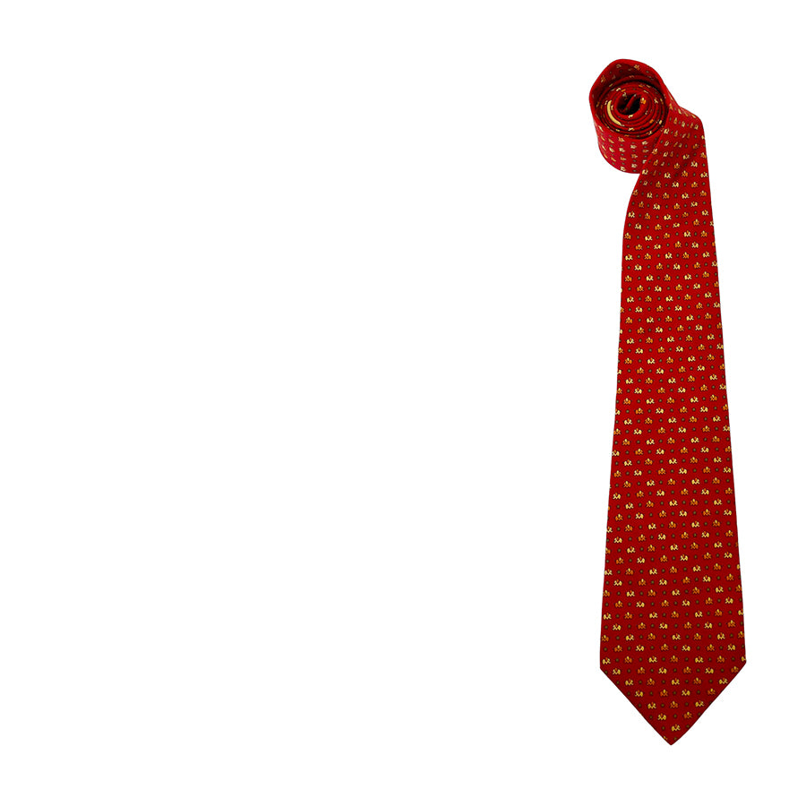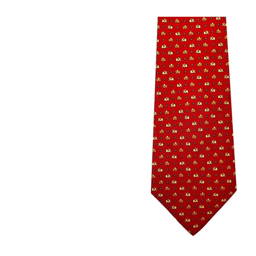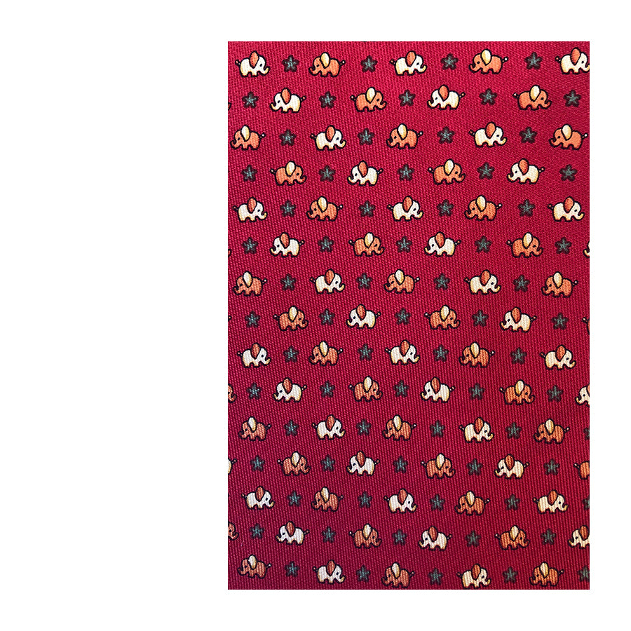 Cravatta Salvatore Ferragamo in seta – Base rossa con motivo a micro-elefantini stilizzati nei toni del bianco e dell’arancio. Il design giocoso e raffinato tipico della Maison Ferragamo la rende un accessorio versatile e di carattere. Un must-have per chi cerca cravatte di lusso vintage anni ’80/’90