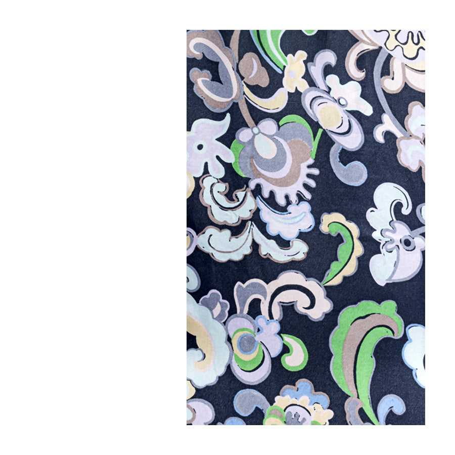 Silhouette aderente con taglio a cuore e drappeggio delicato sul corpetto, spalline con ruches e chiusura posteriore con zip invisibile. Fantasia psichedelica anni '70 nei toni pastello su base polvere.