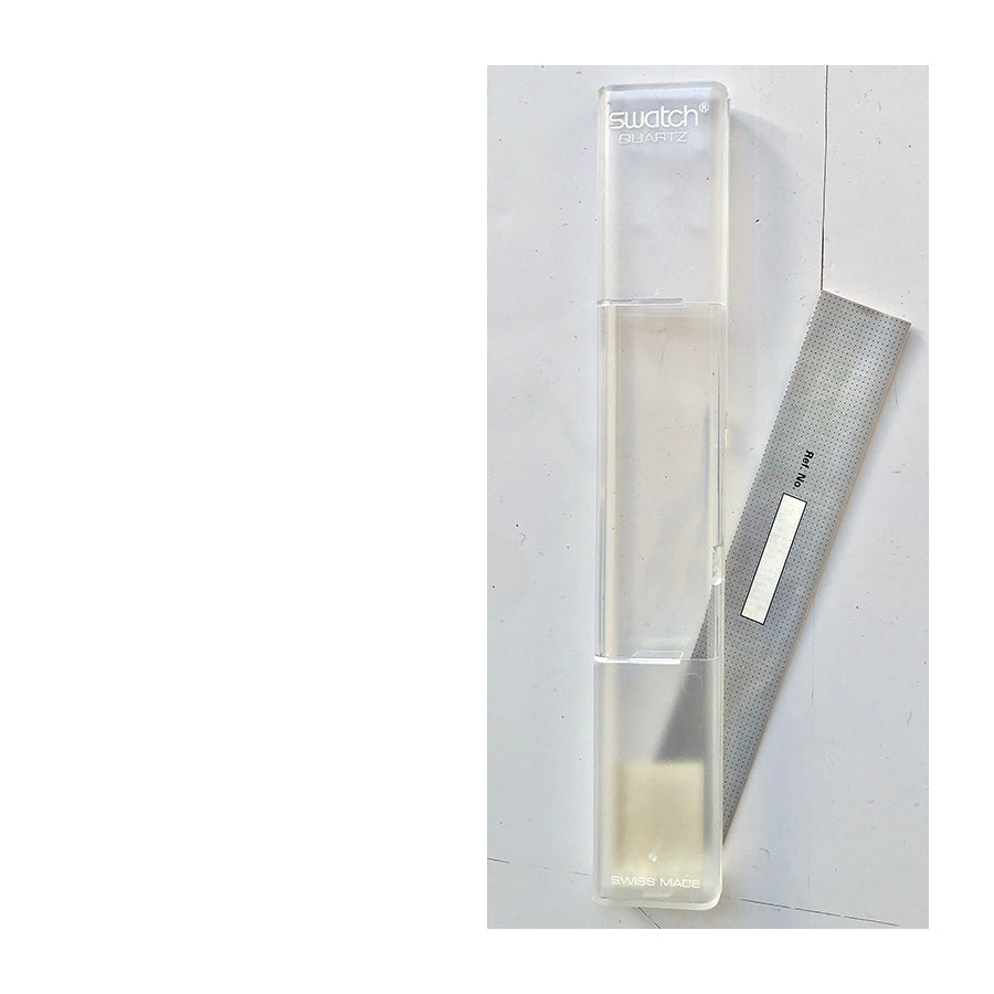 Swatch vintage anni 90 modello LP109 "Polka". Cassa trasparente color pesca, quadrante blu intenso e cinturino pervinca in pelle.