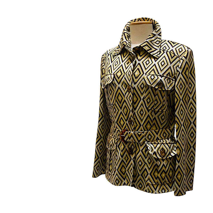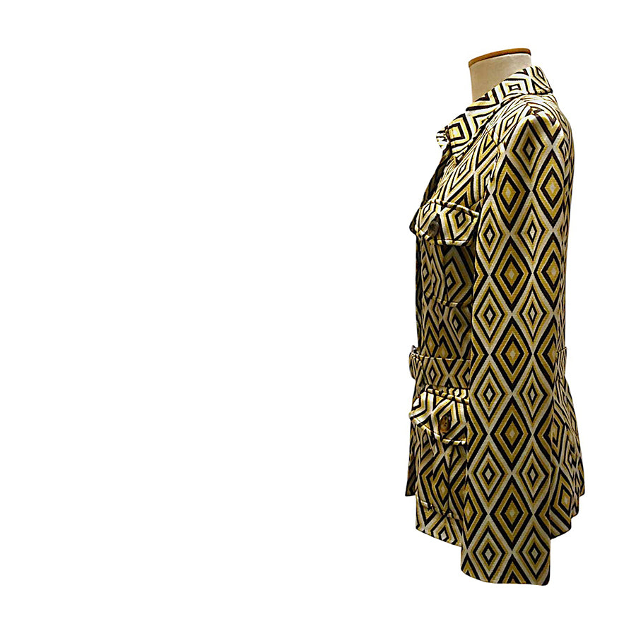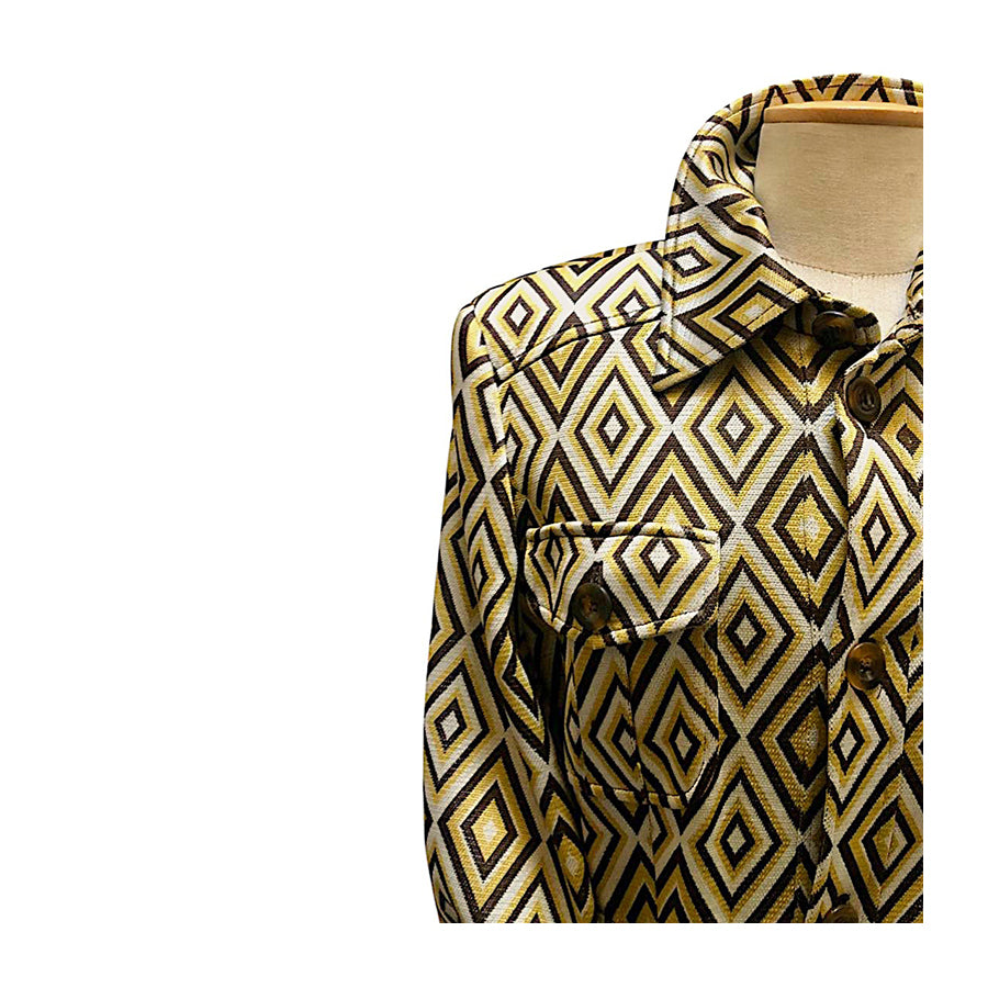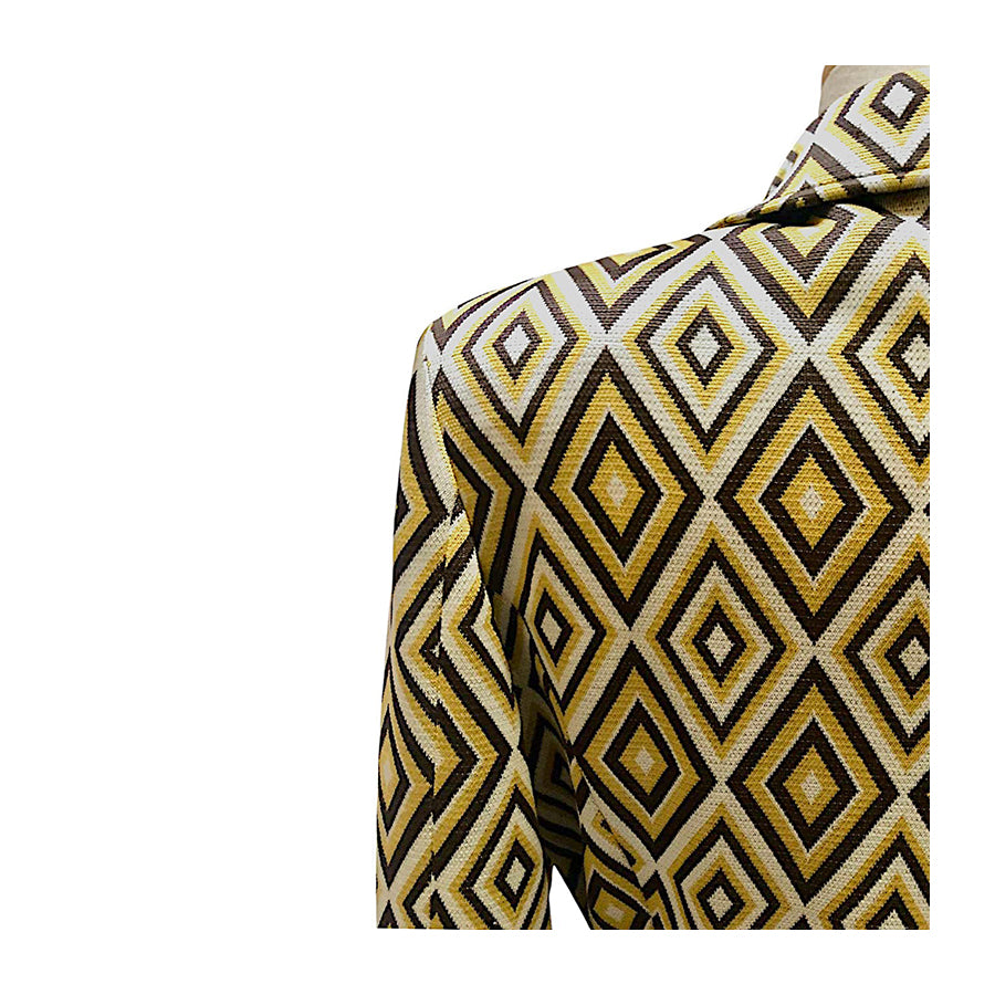 Sahariana vintage Swift anni '70 in maglia strutturata con un motivo geometrico a rombi nei toni del giallo oro, nero e avorio. Cintura coordinatae quattro tasche frontali.