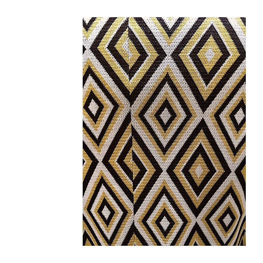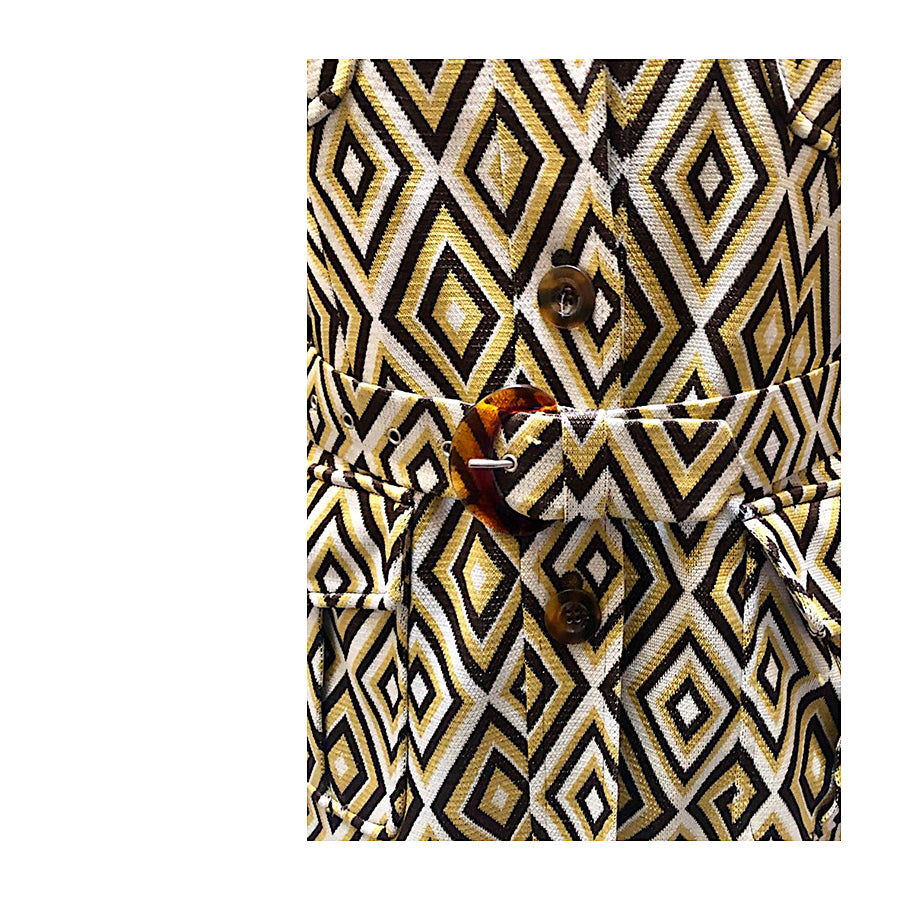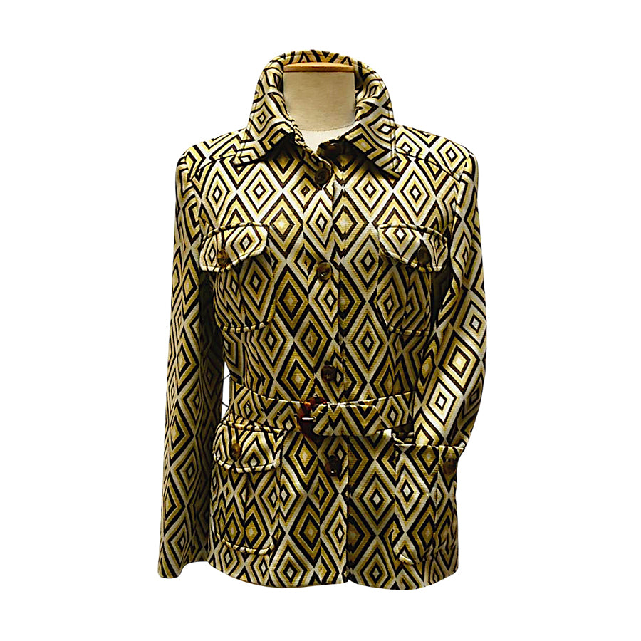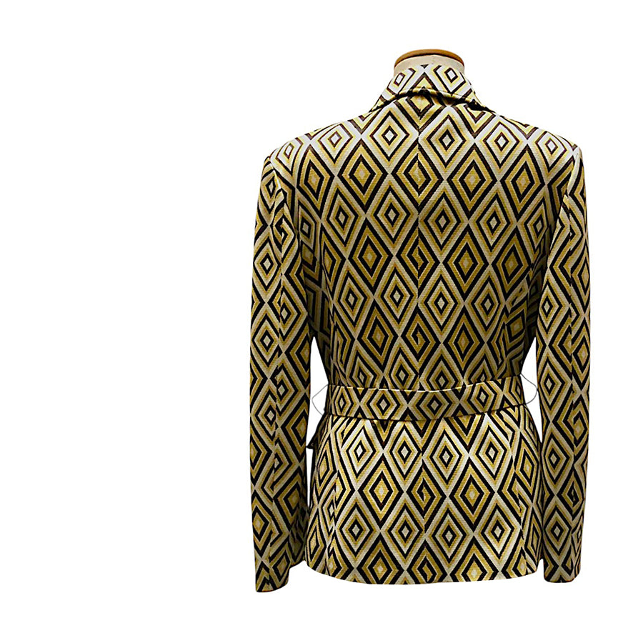 Sahariana vintage Swift anni '70 in maglia strutturata con un motivo geometrico a rombi nei toni del giallo oro, nero e avorio. Cintura coordinatae quattro tasche frontali.