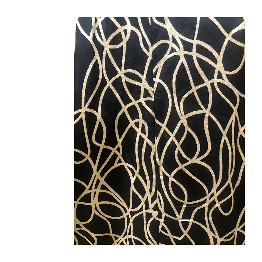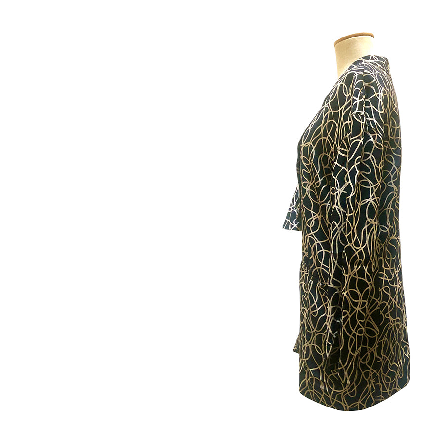 Blazer oversize vintage Trussardi in pura seta nera con stampa astratta panna, leggerissimo e fluido, perfetto come capospalla elegante ma non convenzionale. Taglio morbido, collo sciallato e tessuto lucente.