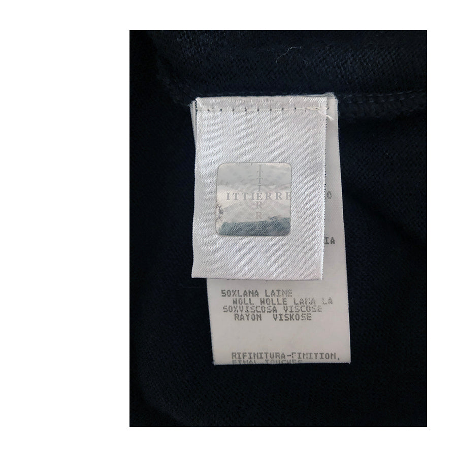 Tubino nero vintage Versace Jeans Couture in lana e viscosa. Il design essenziale con spalline sottili è arricchito da fibbie in metallo argentato con logo Medusa incise, simbolo distintivo della maison Versace. La vestibilità aderente valorizza la silhouette femminile. Un capo Versace anni ’90/2000 raro e ricercato, ideale per le amanti del vintage firmato italiano.