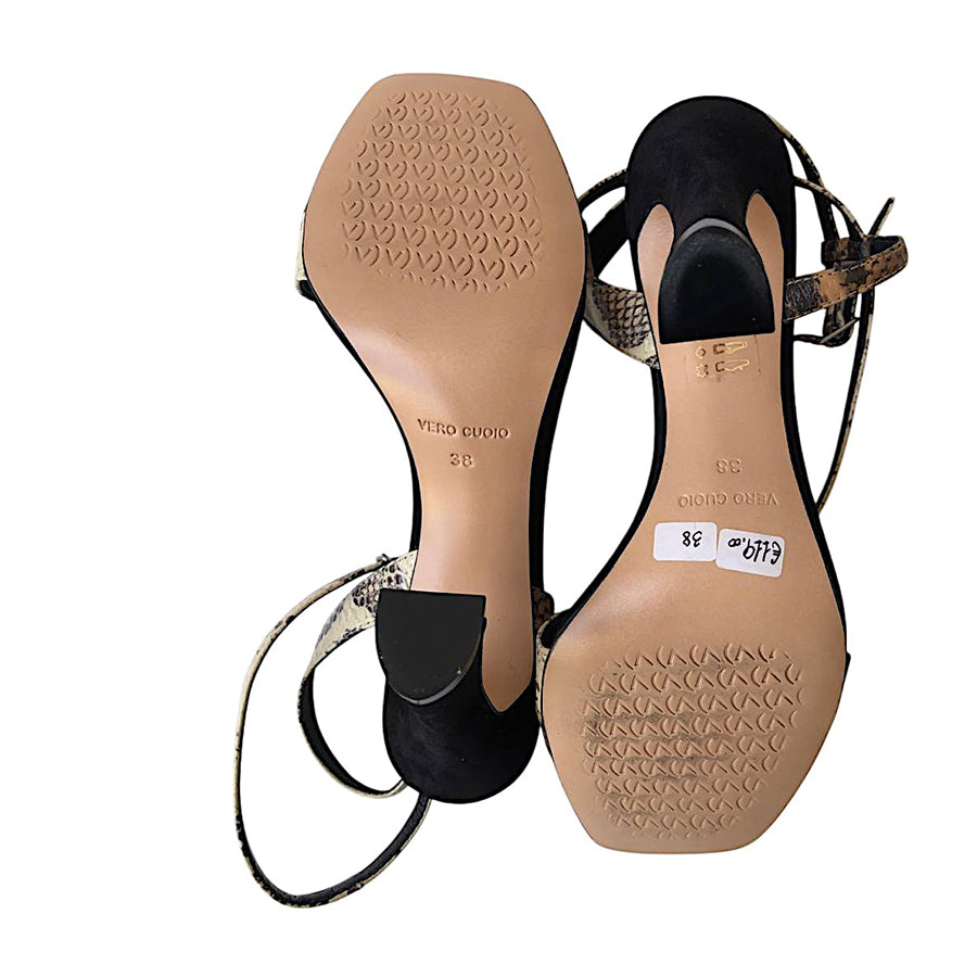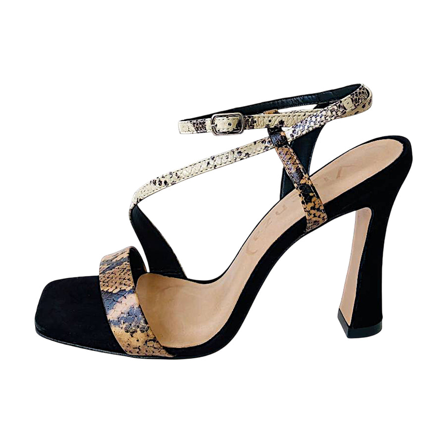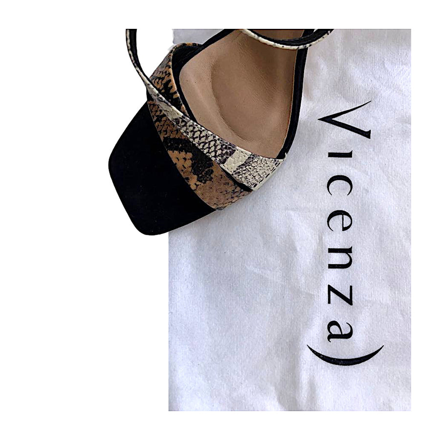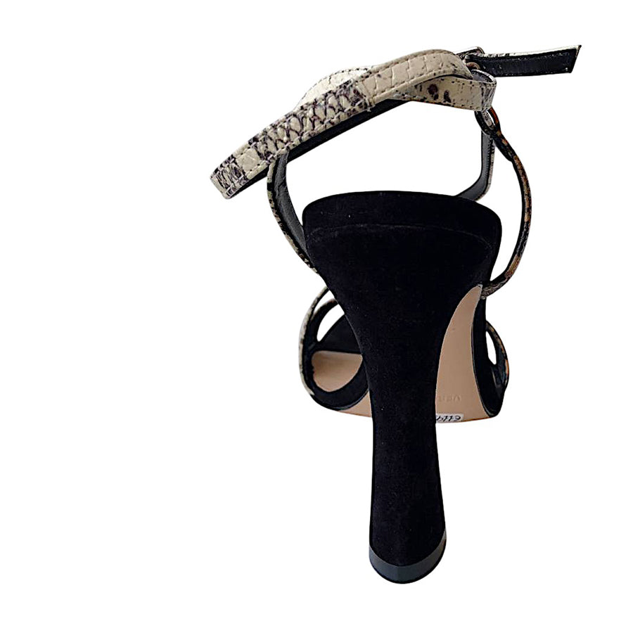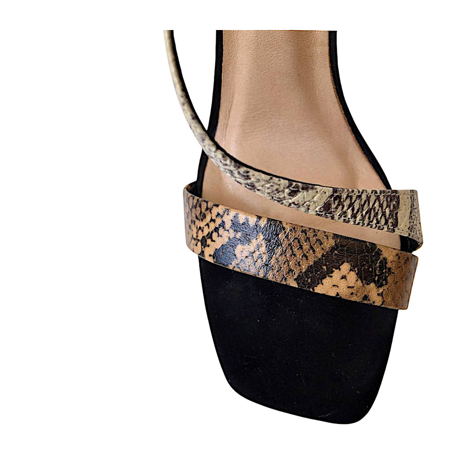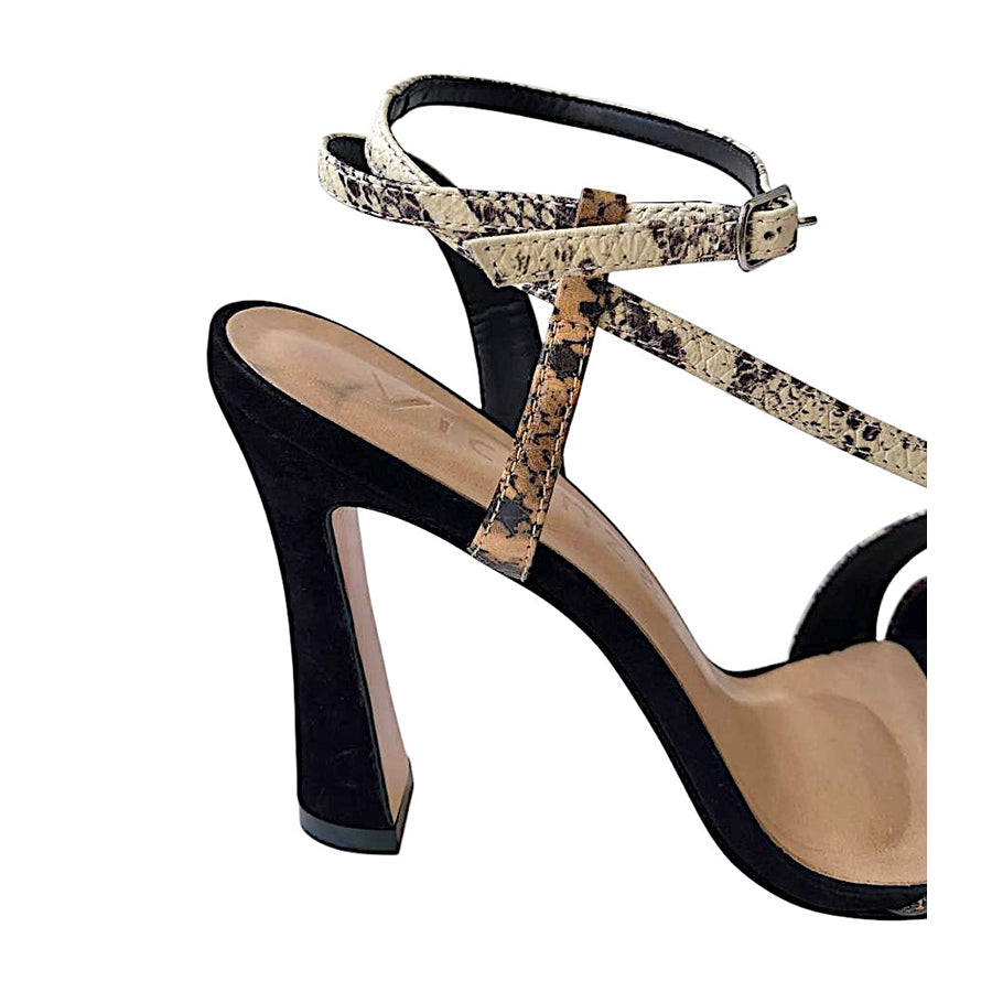 Sandalo ankle strap Vicenza con tacco alto, cinturini a intreccio in stampa pitonata e punta squadrata in suede nera.