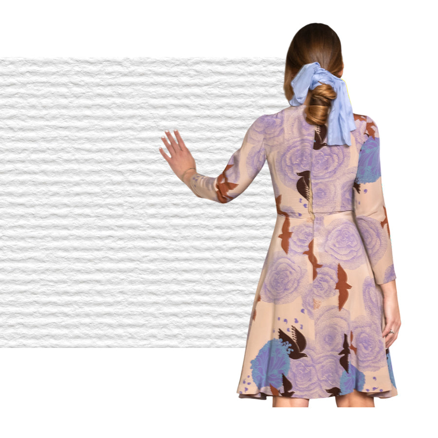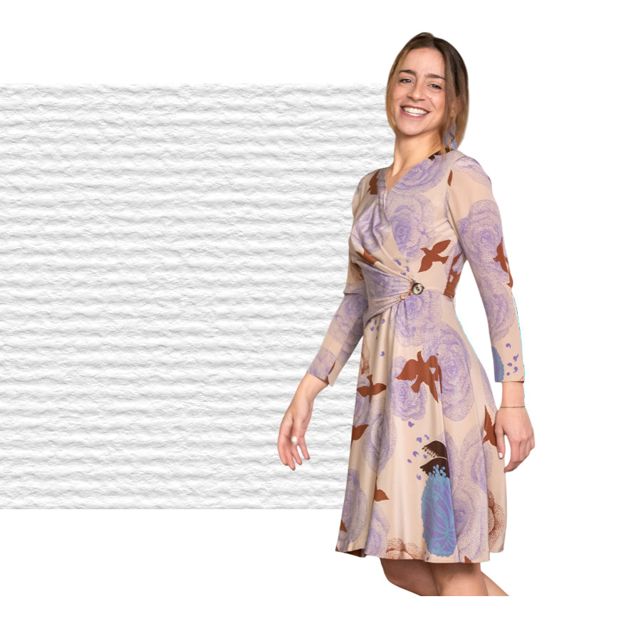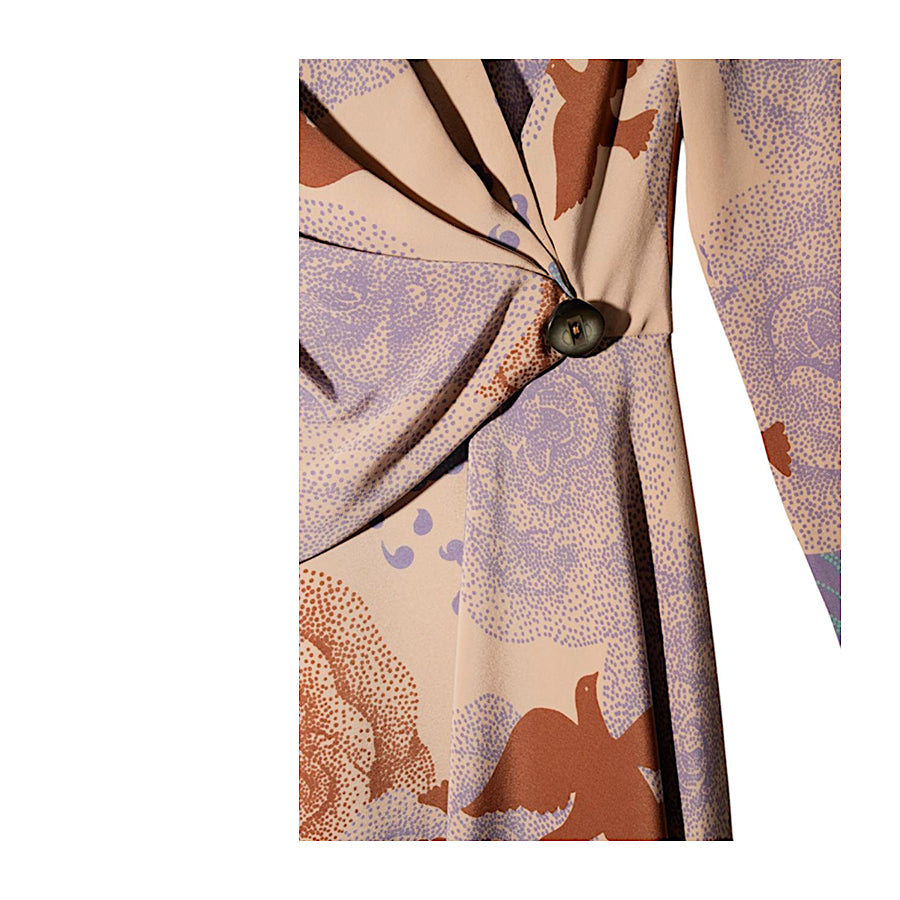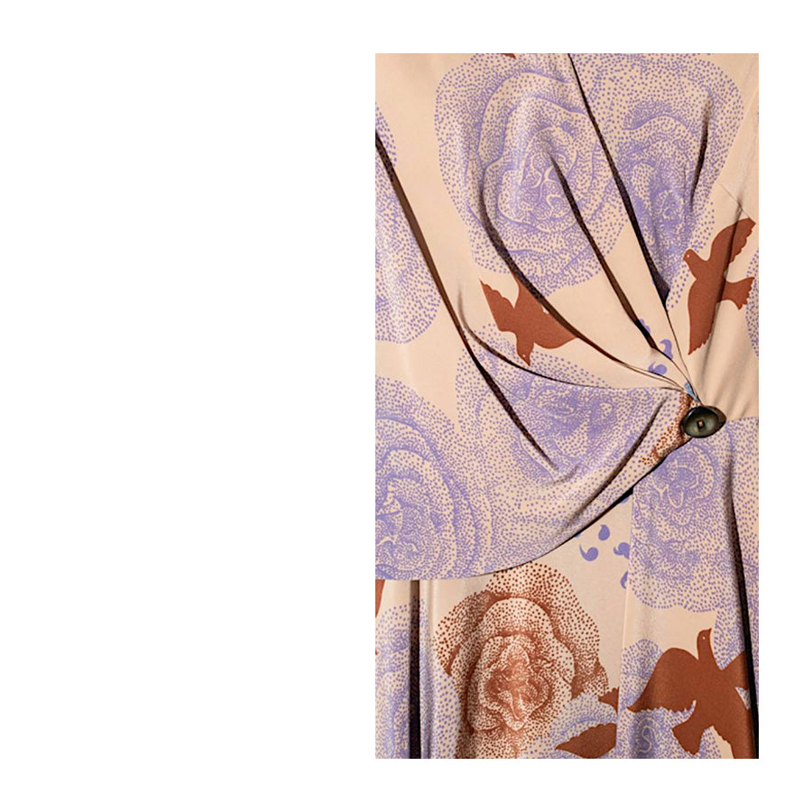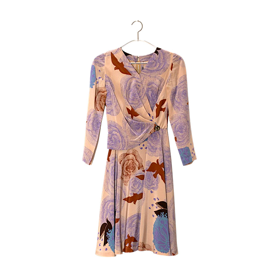 Abito vintage sartoriale in pura seta. Taglio anni '70 con maniche lunghe e scollatura a incrocio, valorizzata da un drappeggio laterale con bottone decorativo. La fantasia floreale astratta si distingue per la sua palette cromatica ricercata: tonalità cipria come base, con grandi rose lavanda, elementi floreali beige e accenti color ruggine e turchese. Gonna morbida e fluida