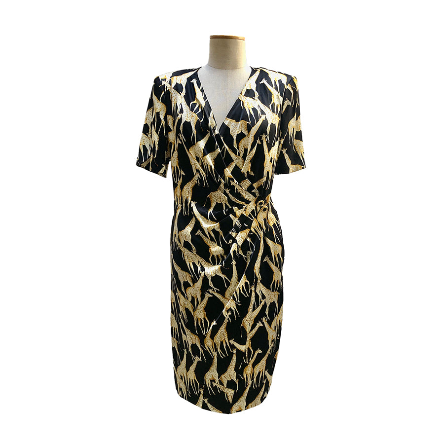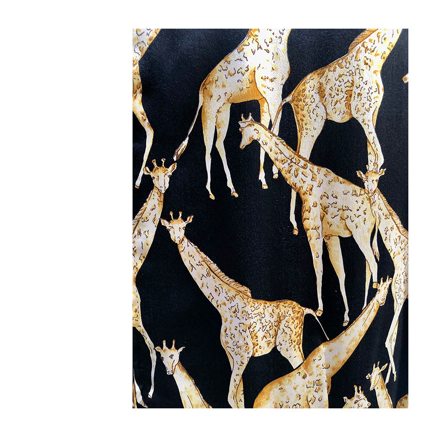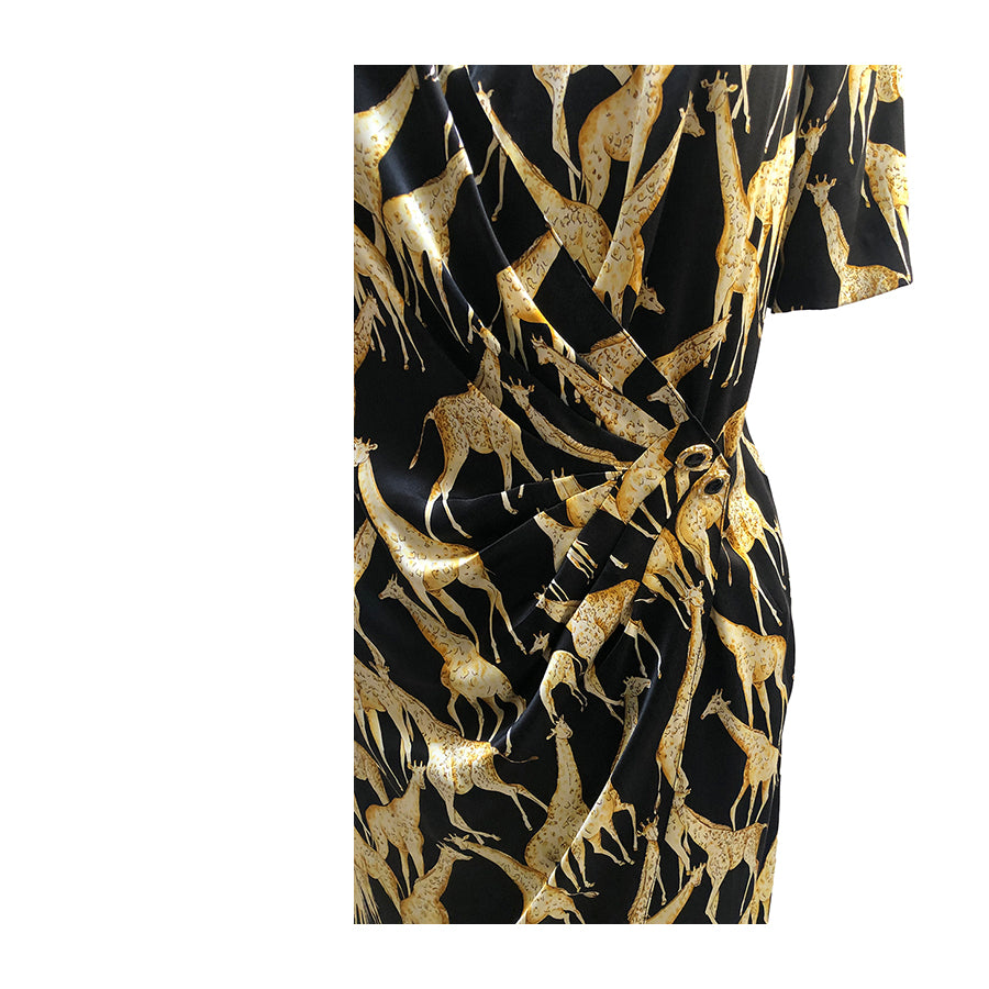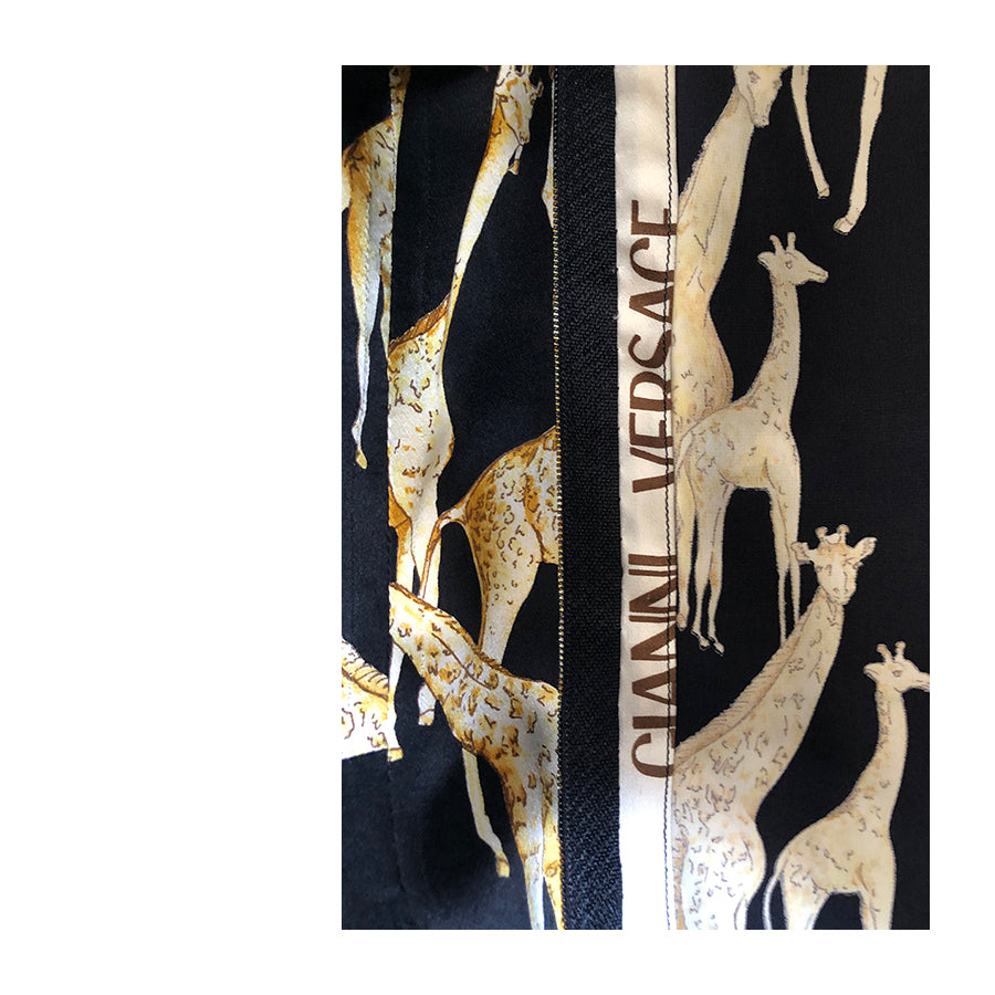 Da collezione: abito sartoriale vintage in seta pura realizzato con tessuto originale Gianni Versace, caratterizzato da una stampa animalier stilizzata con giraffe dorate su fondo nero lucido, tipica della maison negli anni d’oro tra la fine degli ’80 e i primi ’90.