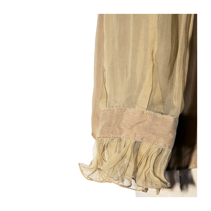 Blusa vintage sartoriale in chiffon di seta color champagne con chiusura doppiopetto e ruches sullo scollo e ai polsini. Taglio fluido, maniche trasparenti e tessuto cangiante leggero.