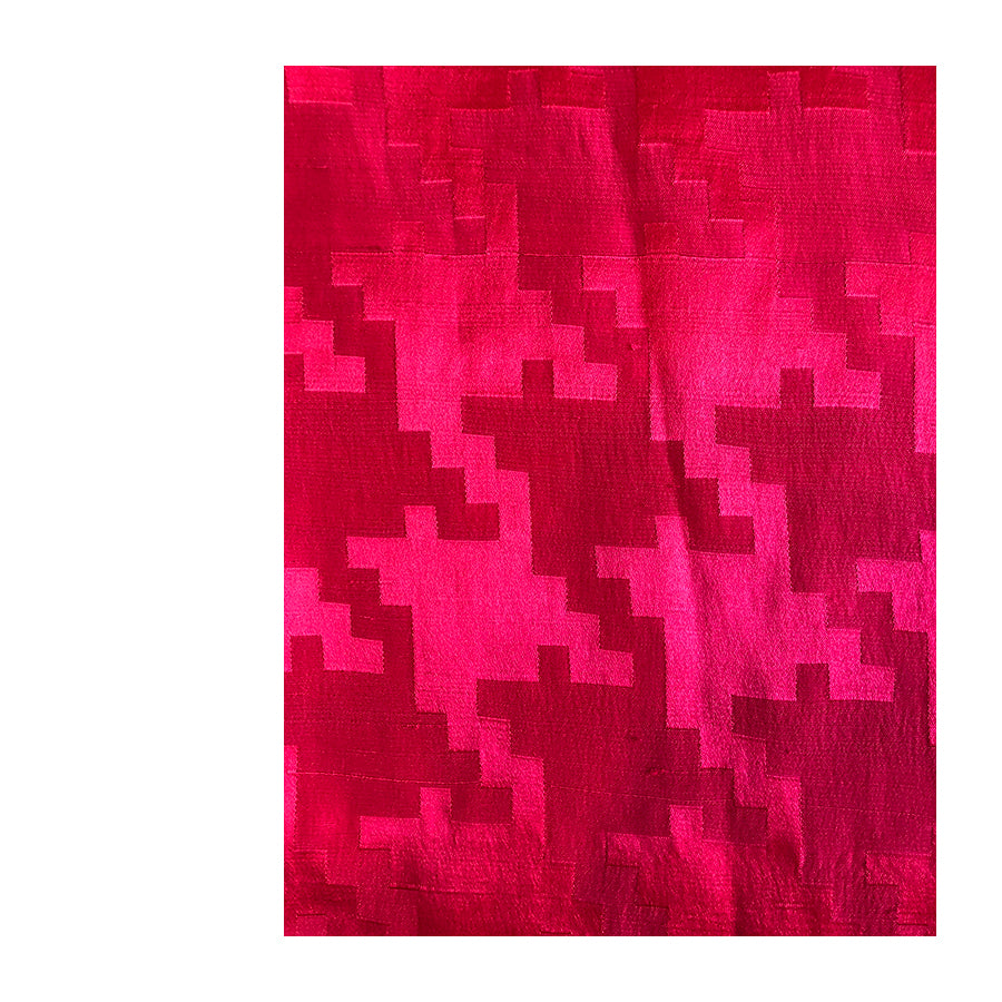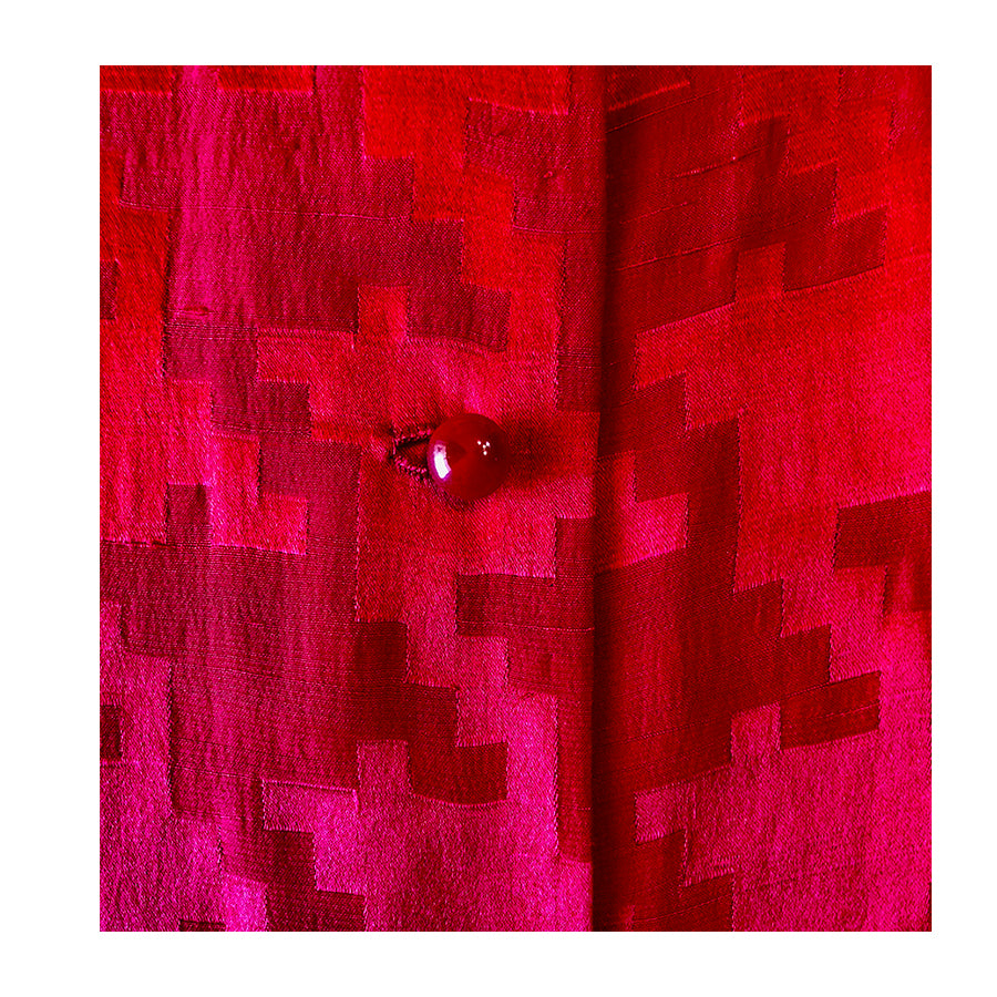 Blusa oversize vintage sartoriale in seta pura rosso ciliegia con fantasia maxi pied de poule ton-sur-ton. Il taglio morbido e dritto accompagna la figura con naturalezza, mentre le maniche corte a kimono e la chiusura frontale con bottoncini rivestiti completano un design sofisticato. Un capo d'autore, simbolo dell’alta sartoria italiana.