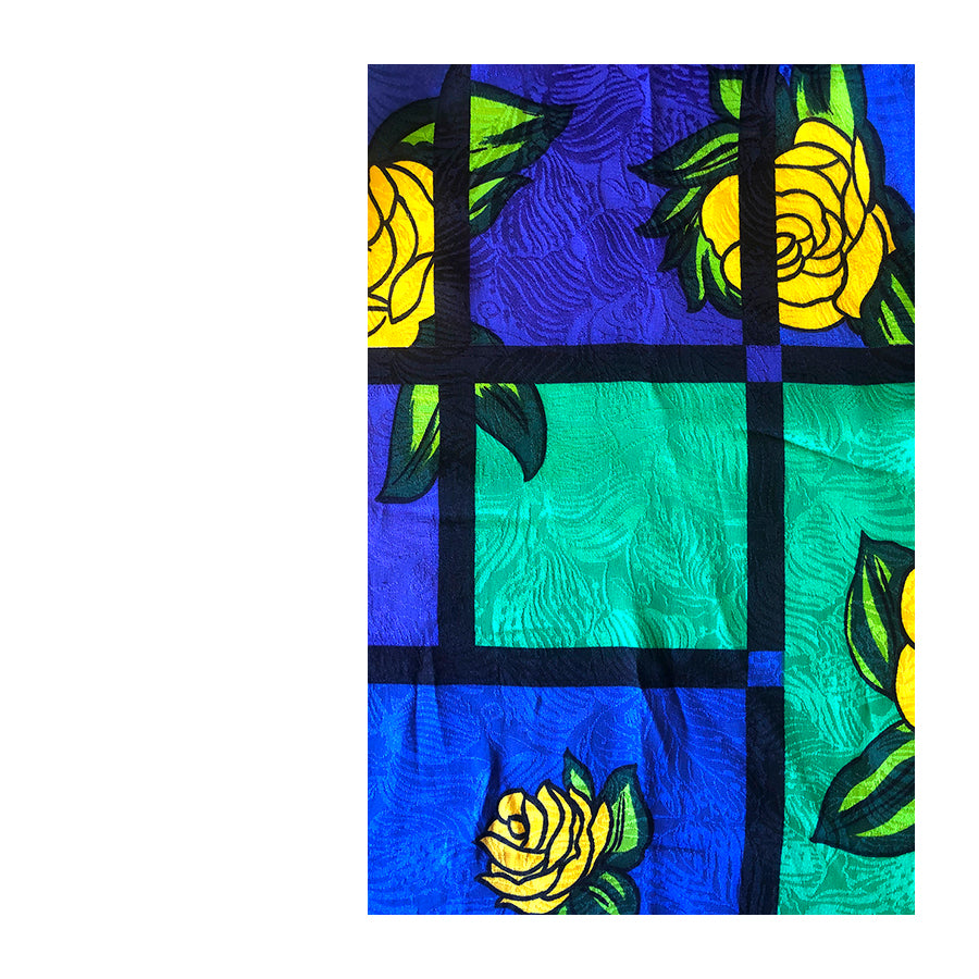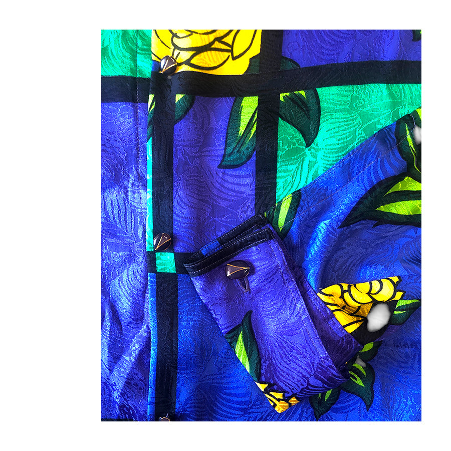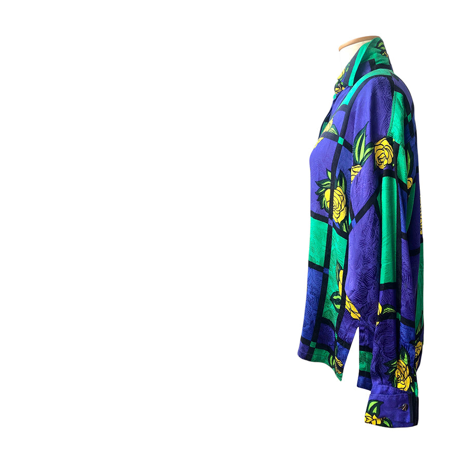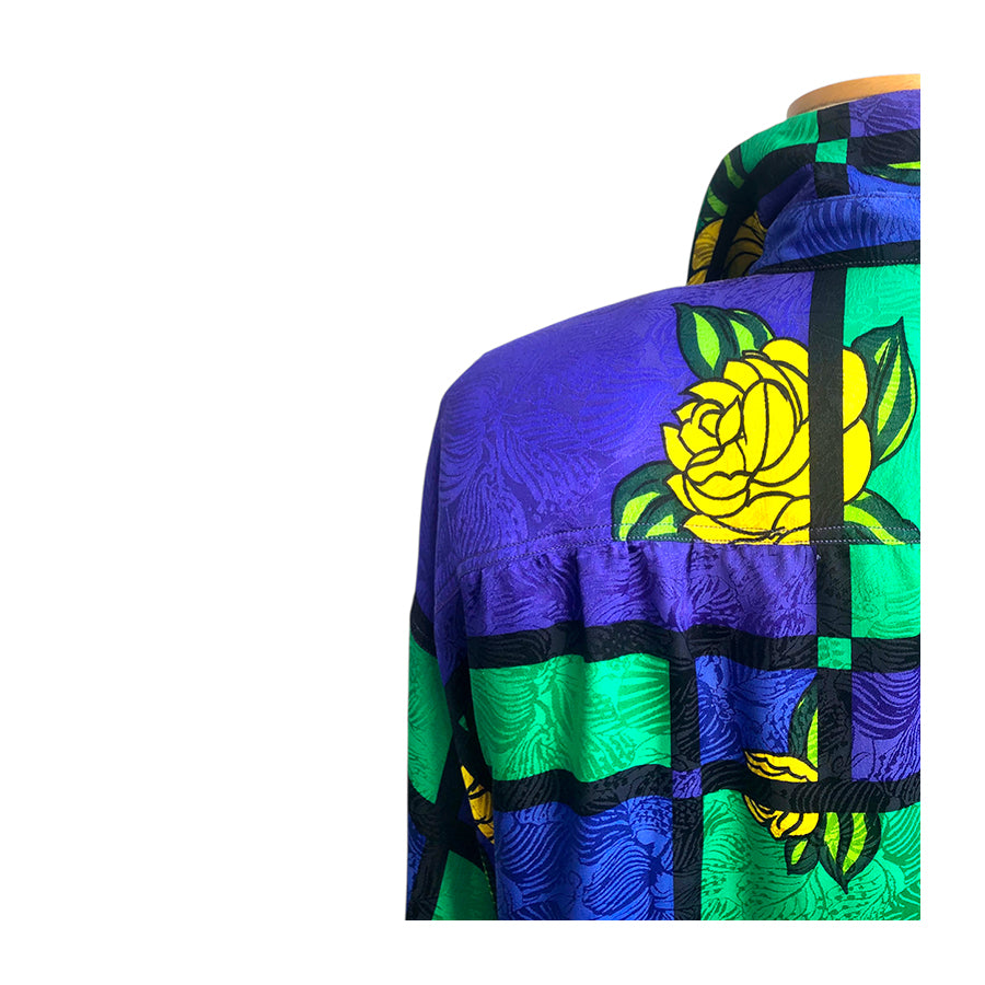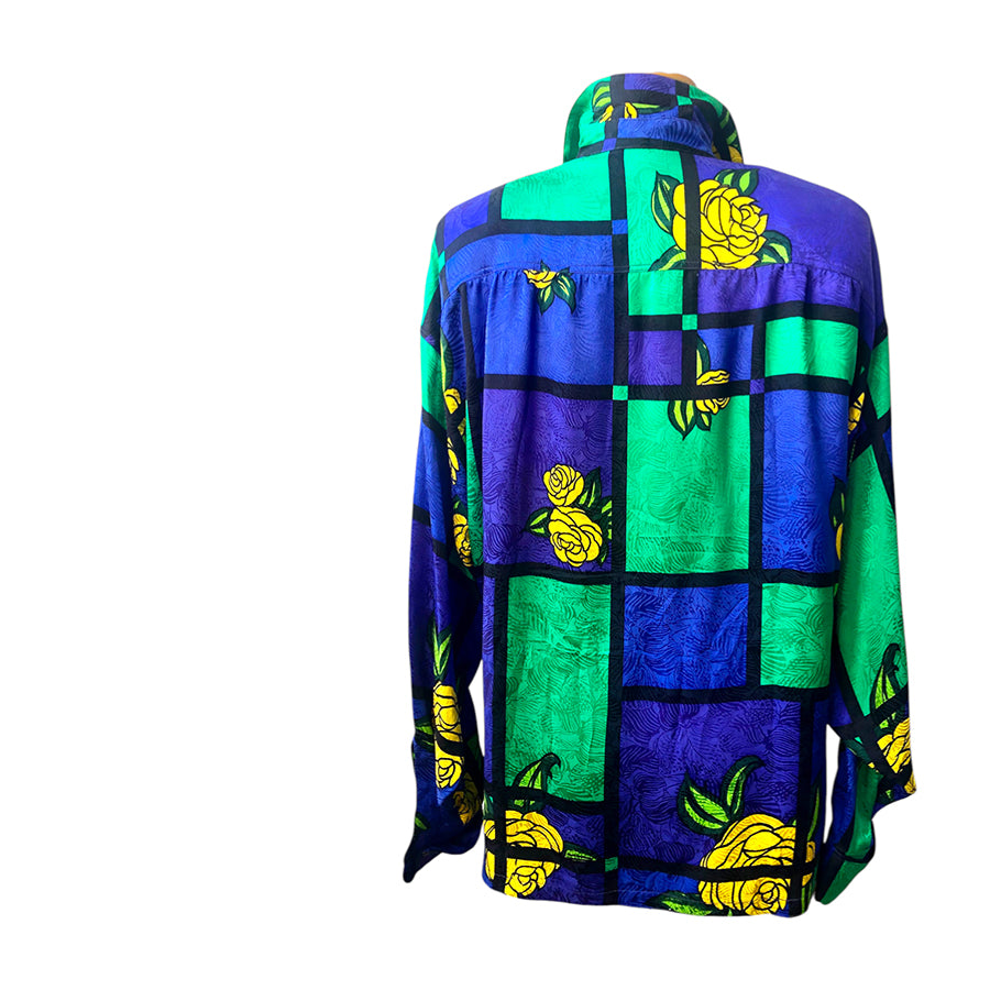 Camicia vintage sartoriale anni ’80 in pura seta con stampa astratta floreale in tonalità decise: viola intenso, verde smeraldo, giallo limone e nero. Il tessuto presenta una lavorazione jacquard tono su tono con motivi floreali leggermente lucidi, che donano profondità e movimento. Taglio classico con colletto a punta, maniche lunghe con polsini abbottonati e vestibilità morbida leggermente oversize.