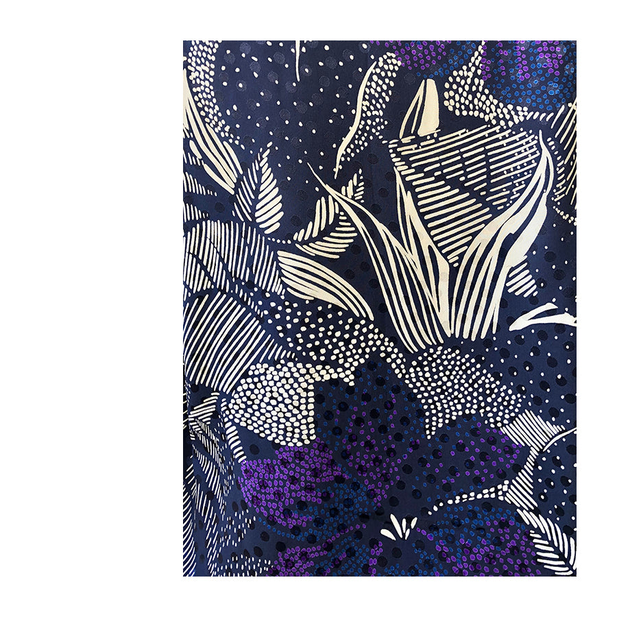 Blusa vintage sartoriale in seta con stampa floreale e botanica in toni intensi di blu, viola, bianco e accenni di verde. Un doppio pannello frontale drappeggiato crea un morbido effetto cascata sul décolleté e dona al capo una silhouette fluida e sofisticata. Taglio comodo e maniche lunghe leggermente arricciate sui polsi. Un capo senza tempo.