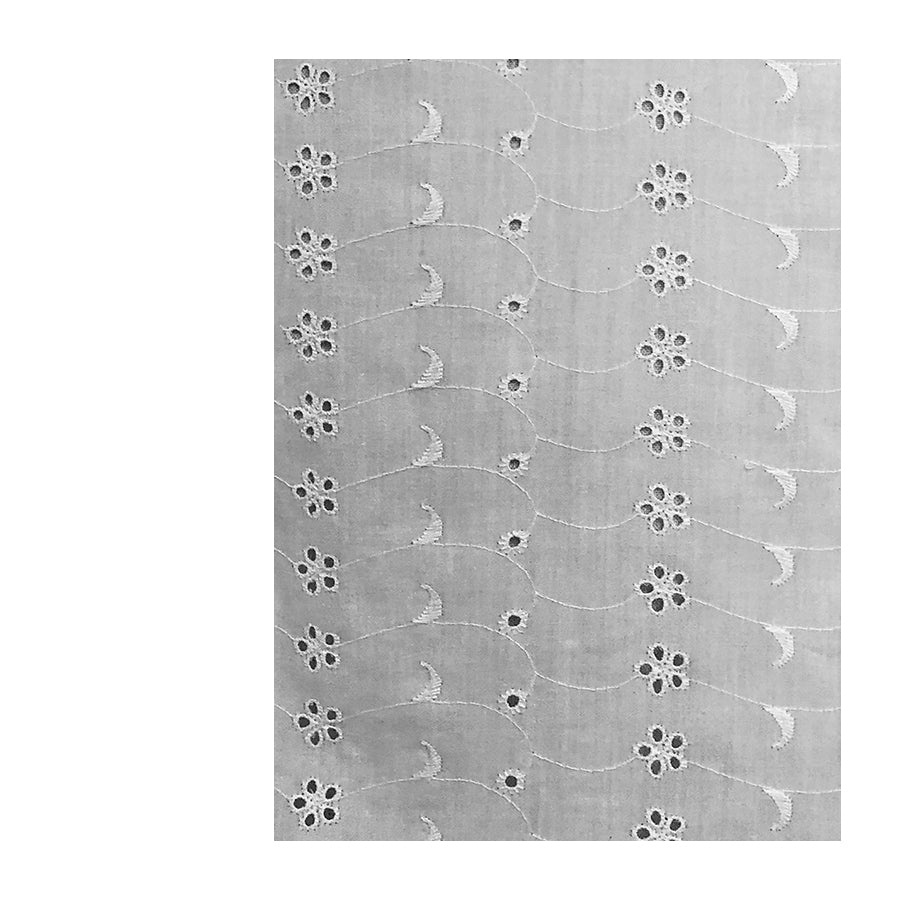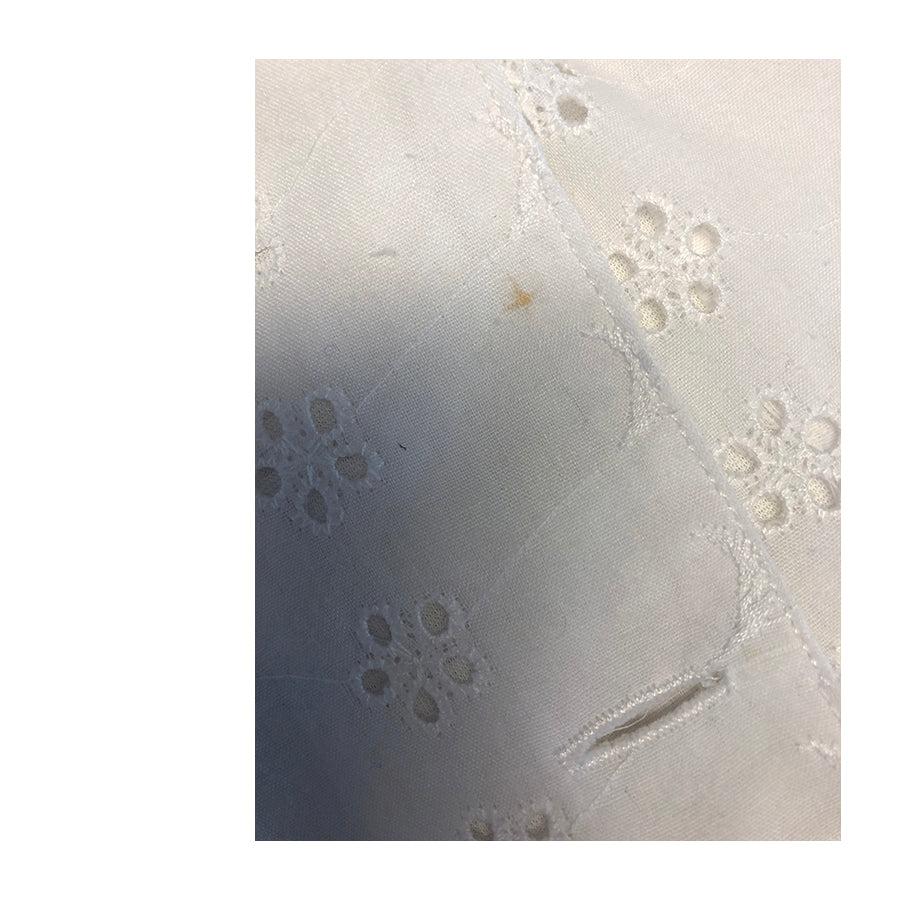 Top vintage sartoriale in cotone sangallo bianco. Modello smanicato all’americana, colletto a revers e chiusura frontale a bottoni.