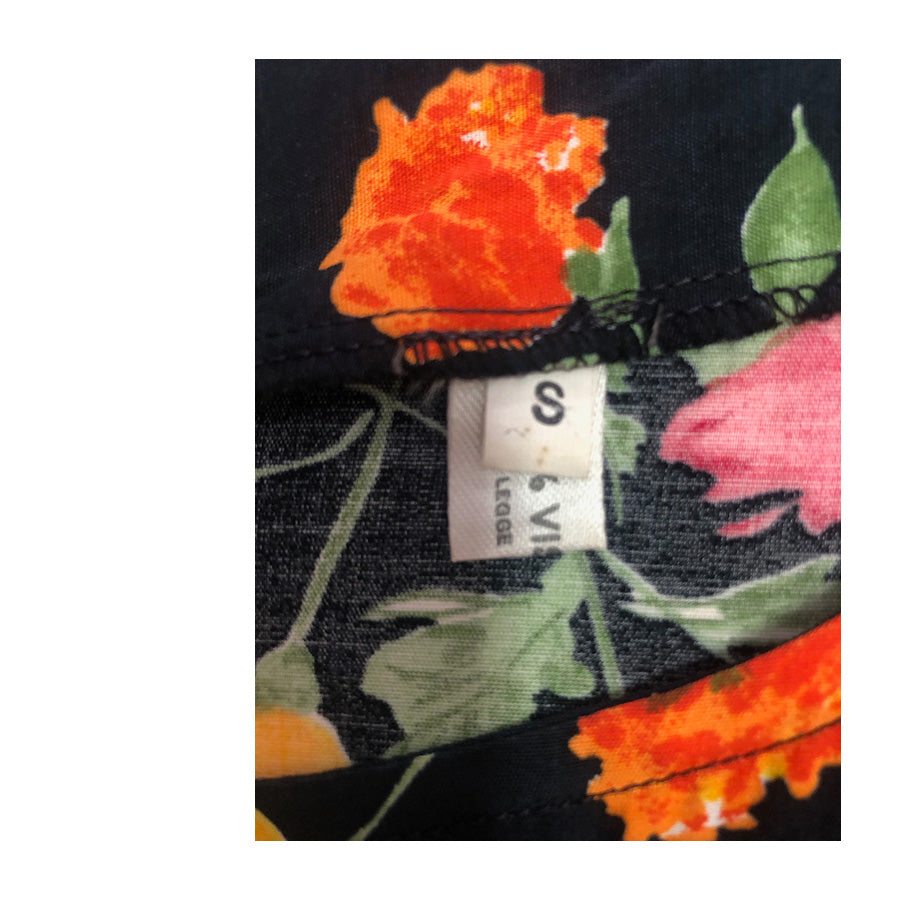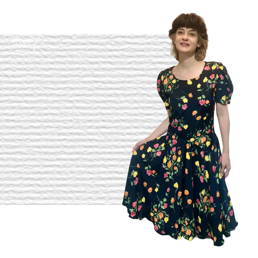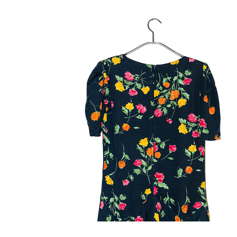 Abito vintage'80 in viscosa, caratterizzato da una stampa floreale vivace su base blu navy. Il taglio svasato con ampia gonna a ruota e maniche corte con leggera arricciatura sulle spalle.
