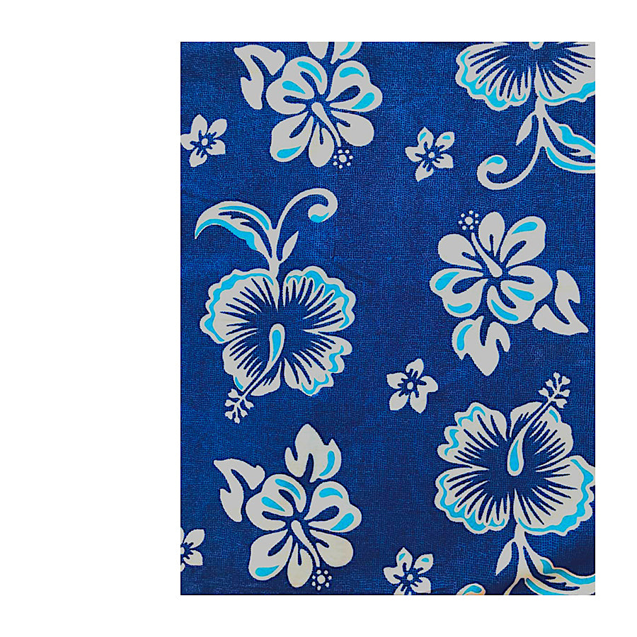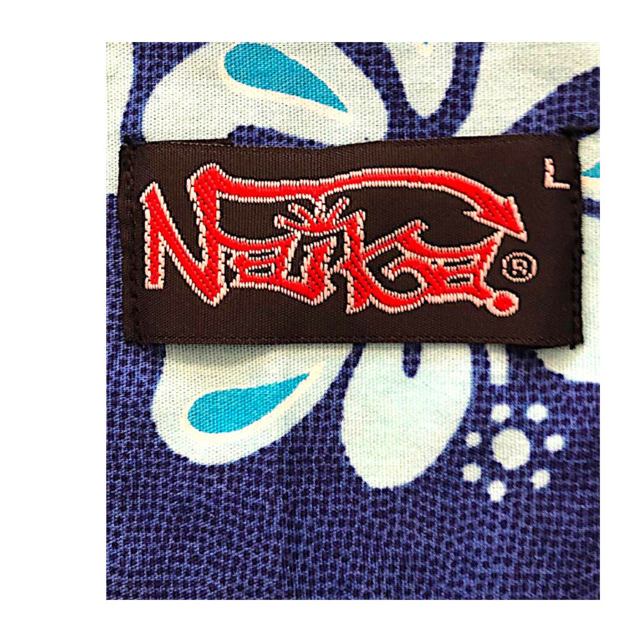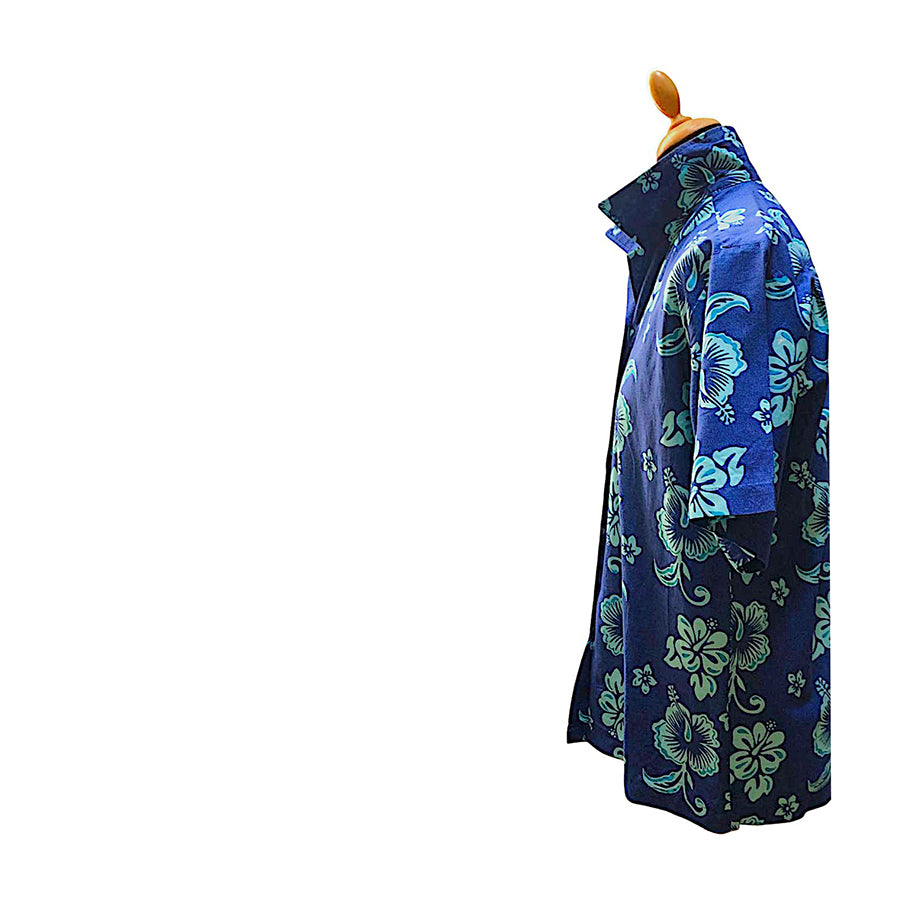 Aloha shirt vintage ‘90 puro stile hawaiano in cotone. Sfondo blu oceano con l’iconica stampa floreale tropicale a fiori di ibisco acquamarina e verde menta, chiusura con bottoni in legno e tasca frontale sul petto con motivo allineato.