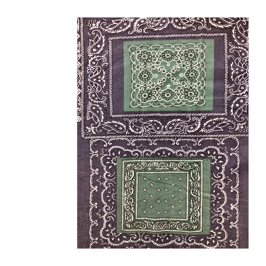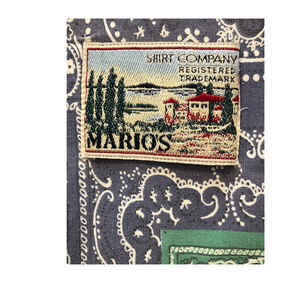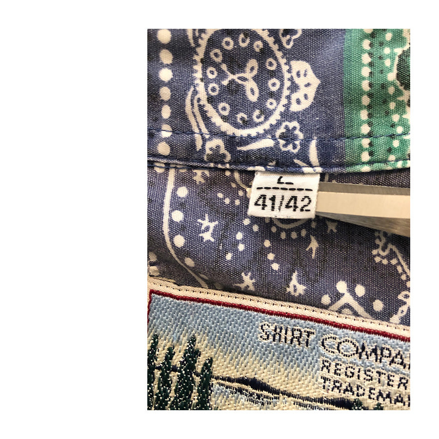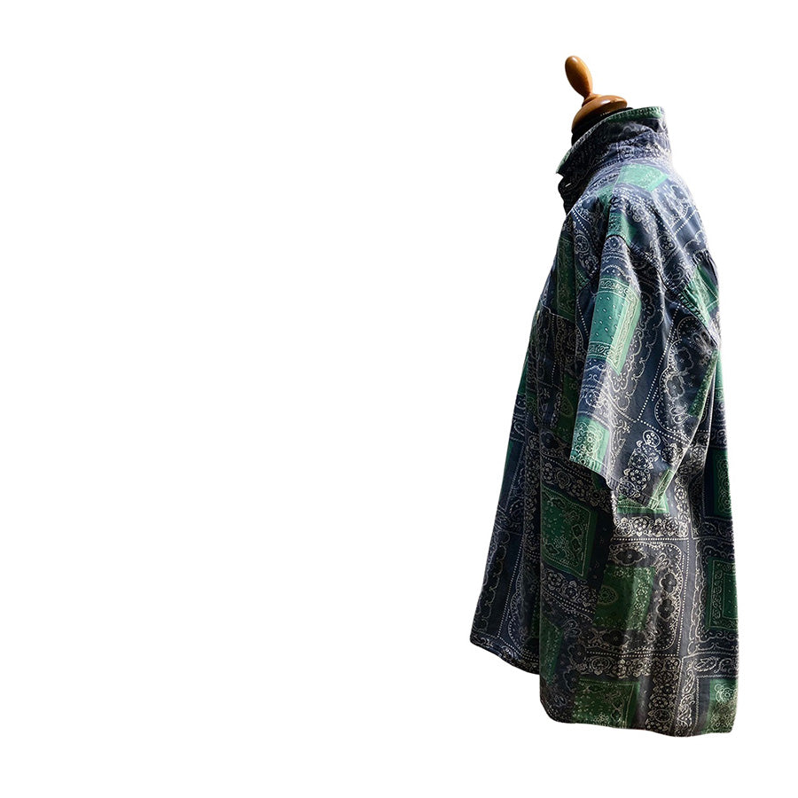 Aloha shirt vintage ’90 a maniche corte con stampa bandana nei toni del verde smeraldo e blu navy. Realizzata in cotone, ha un taglio rilassato, chiusura frontale con bottoni e taschino sul petto. La fantasia patchwork si ispira alle iconiche bandane Paisley