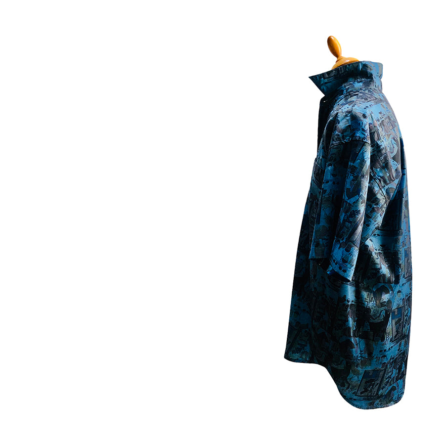 Camicia vintage in pura seta tailandese, leggera e raffinata, con stampa artistica etnica nei toni del blu e nero. Il design oversize con maniche corte e bottoni in madreperla la rende un pezzo unico e super chic, perfetta per uno stile boho, casual o da collezione.