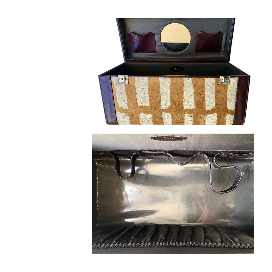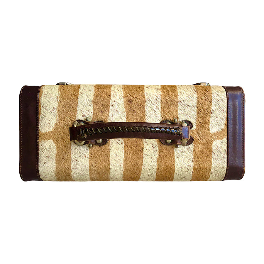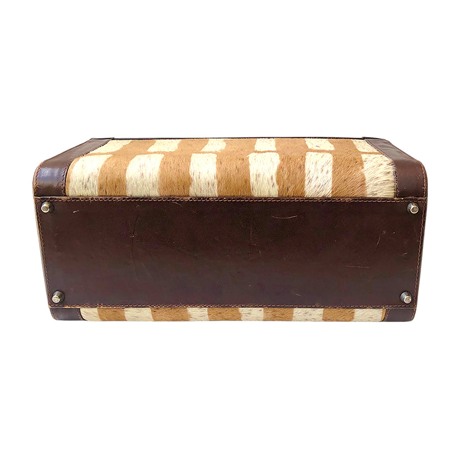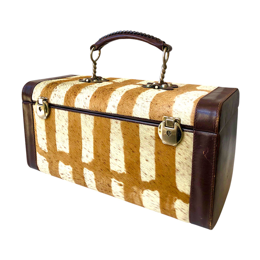 Beauty vintage in pelle marrone e cavallino zebrato con dettagli metallici dorati e manico intrecciato. Solido, strutturato e super affascinante.