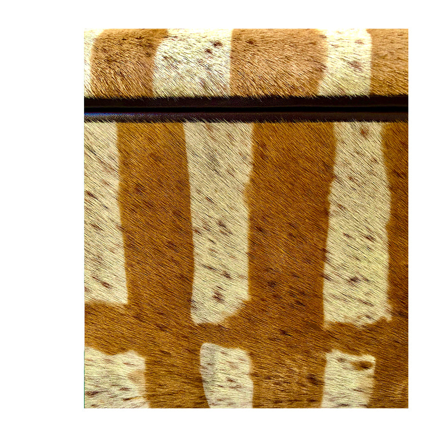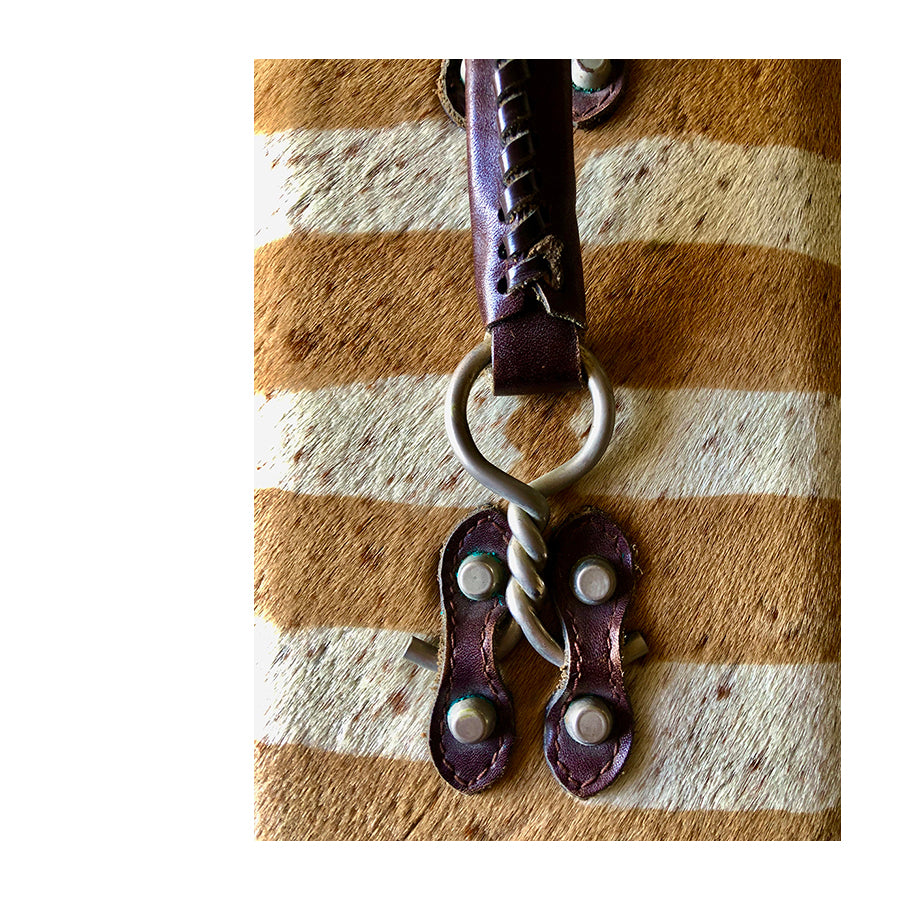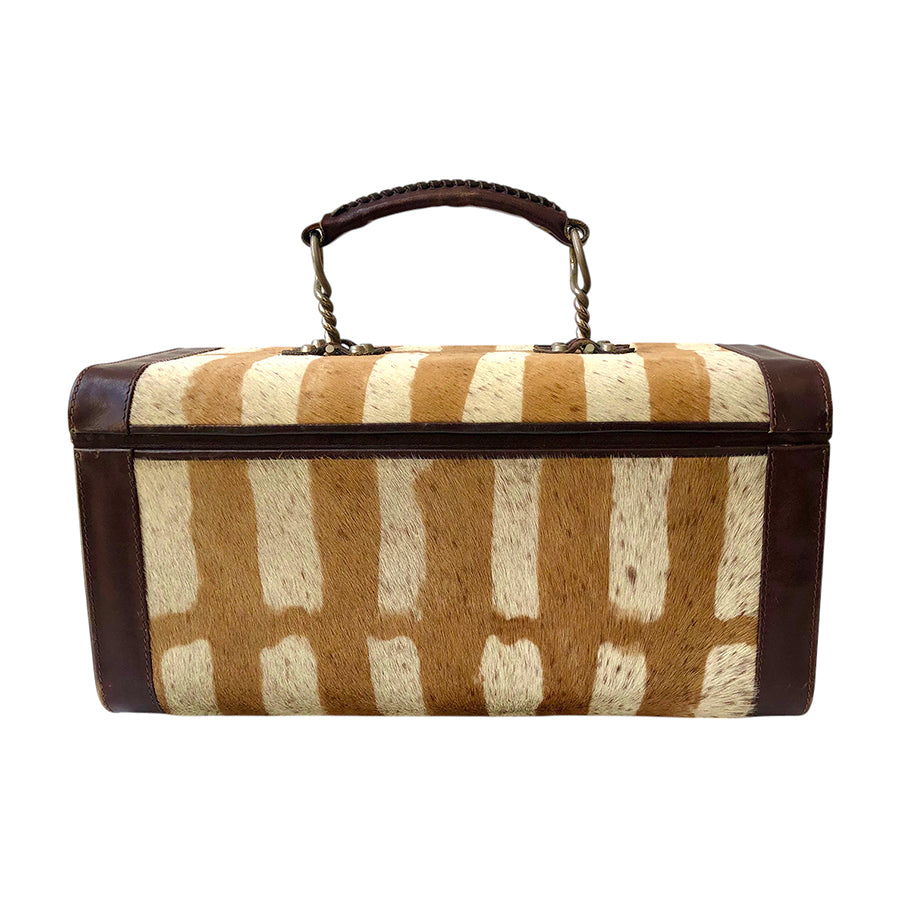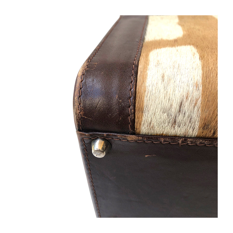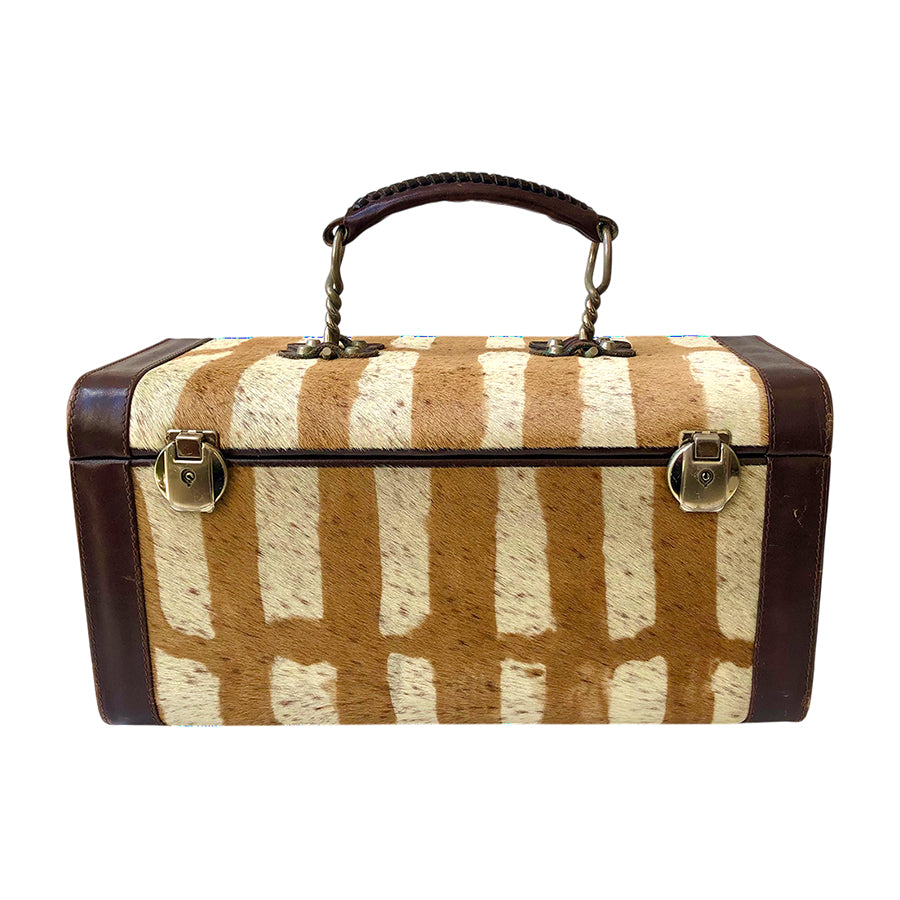 Beauty vintage in pelle marrone e cavallino zebrato con dettagli metallici dorati e manico intrecciato. Solido, strutturato e super affascinante.