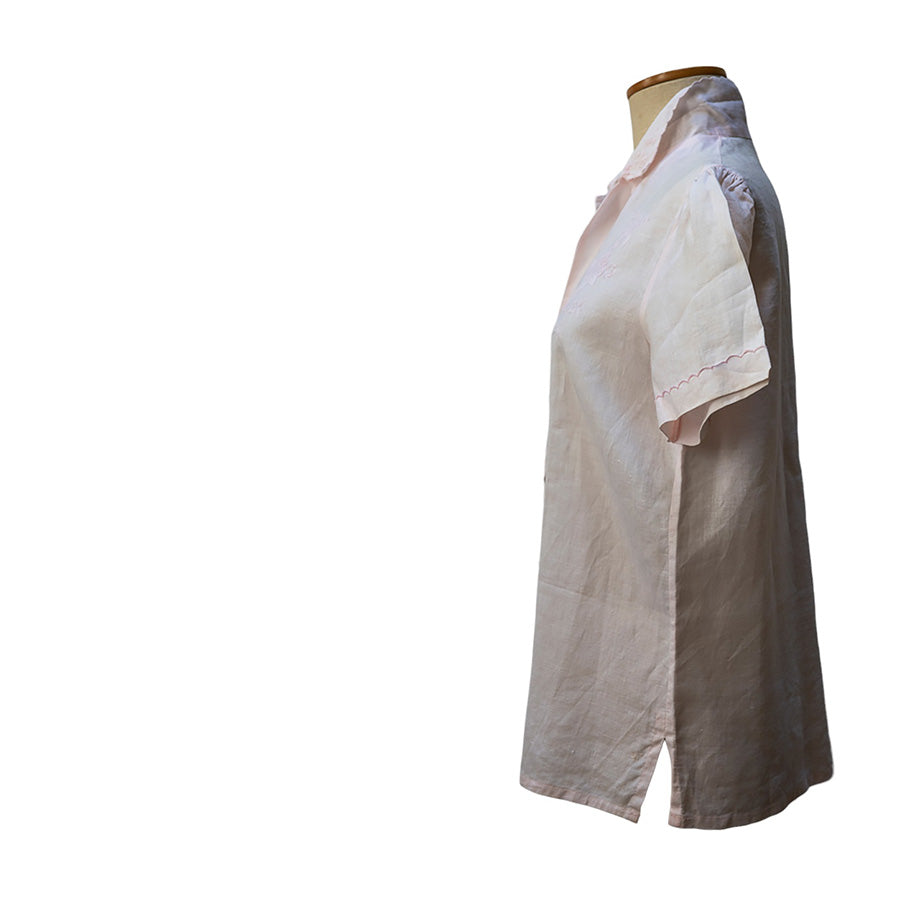 Camicia vintage in lino. Caratterizzata da una raffinata tonalità rosa cipria chiarissima e impreziosita da ricami floreali tono su tono con piccoli dettagli traforati. Maniche corte a palloncino leggero con bordo ricamato.