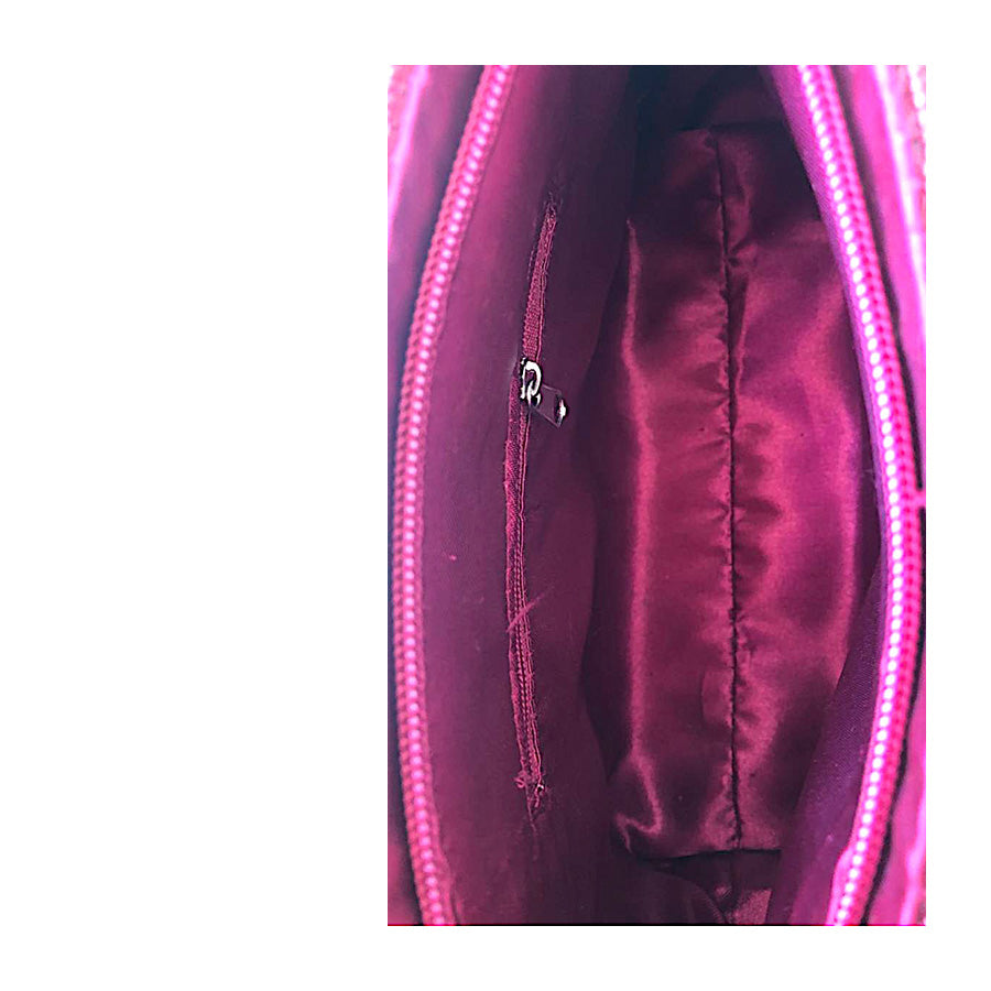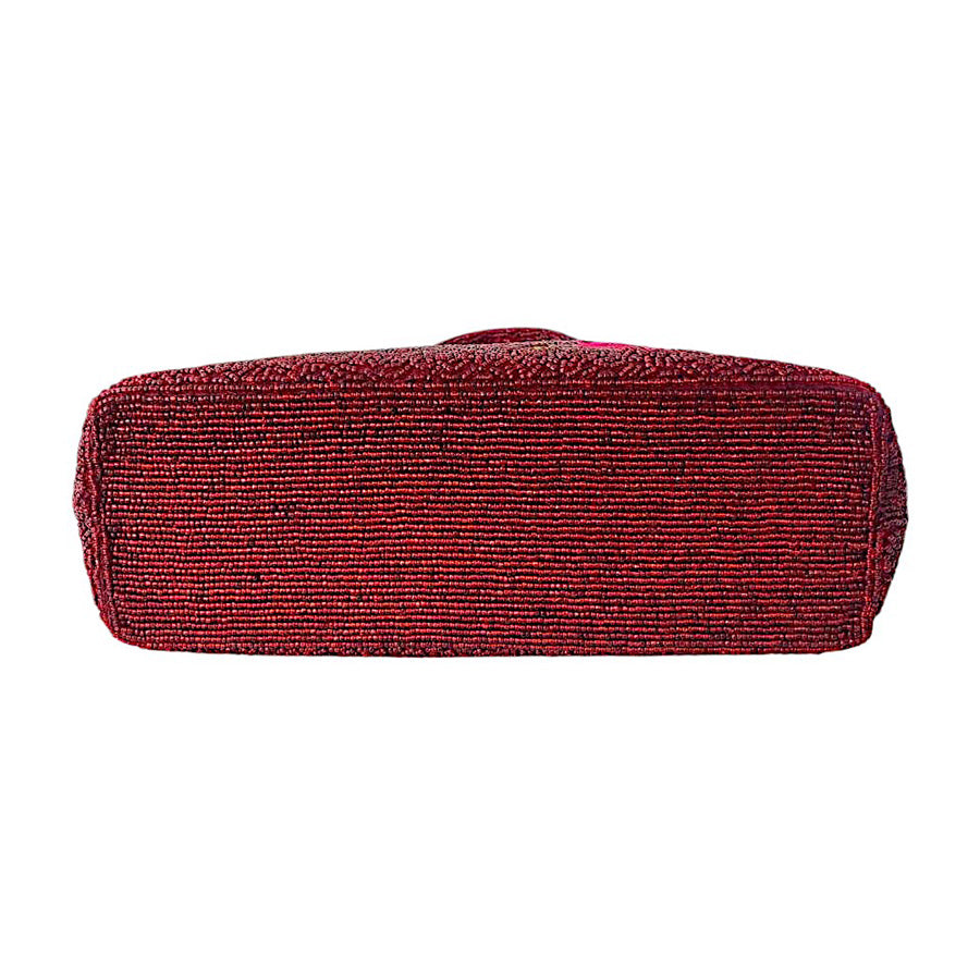Borsa vintage in tessuto bordeaux interamente ricamata a mano con perline e fiori rosa. Manici imbottiti coordinati e dettagli floreali vivaci dal tono boho chic.