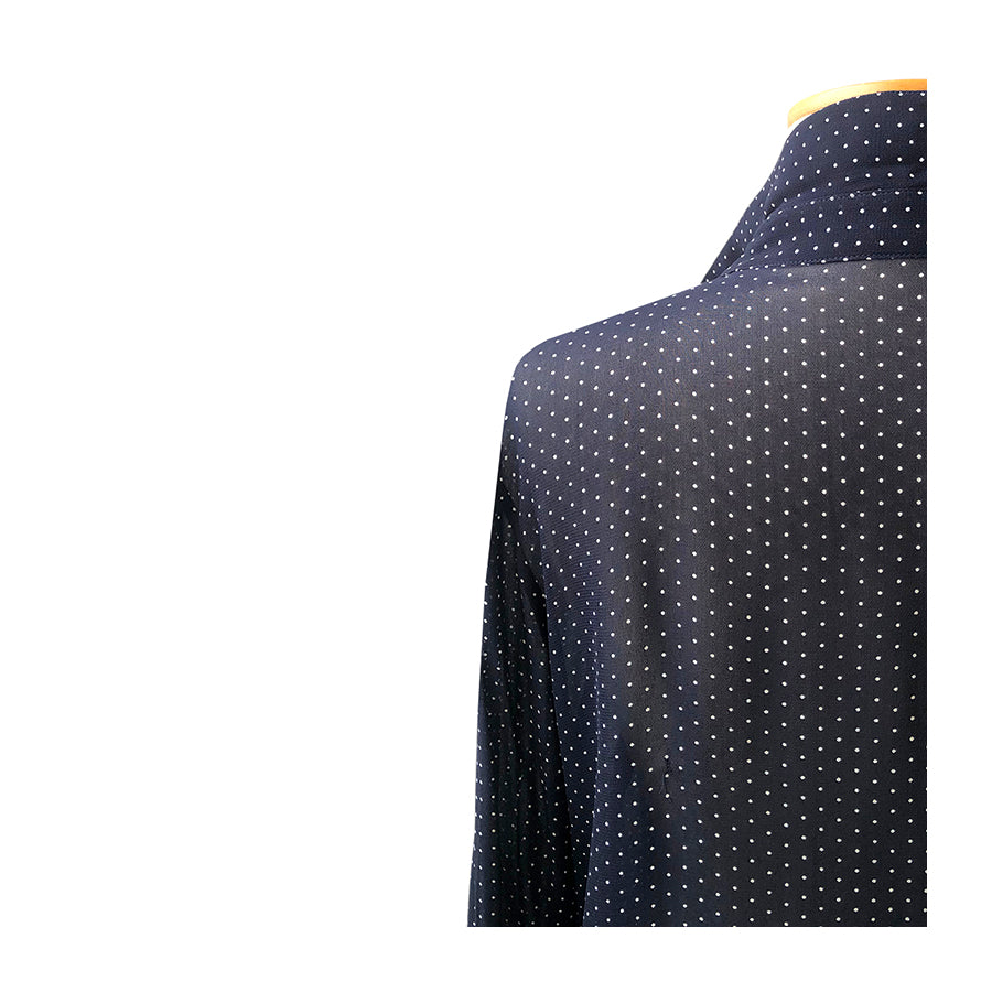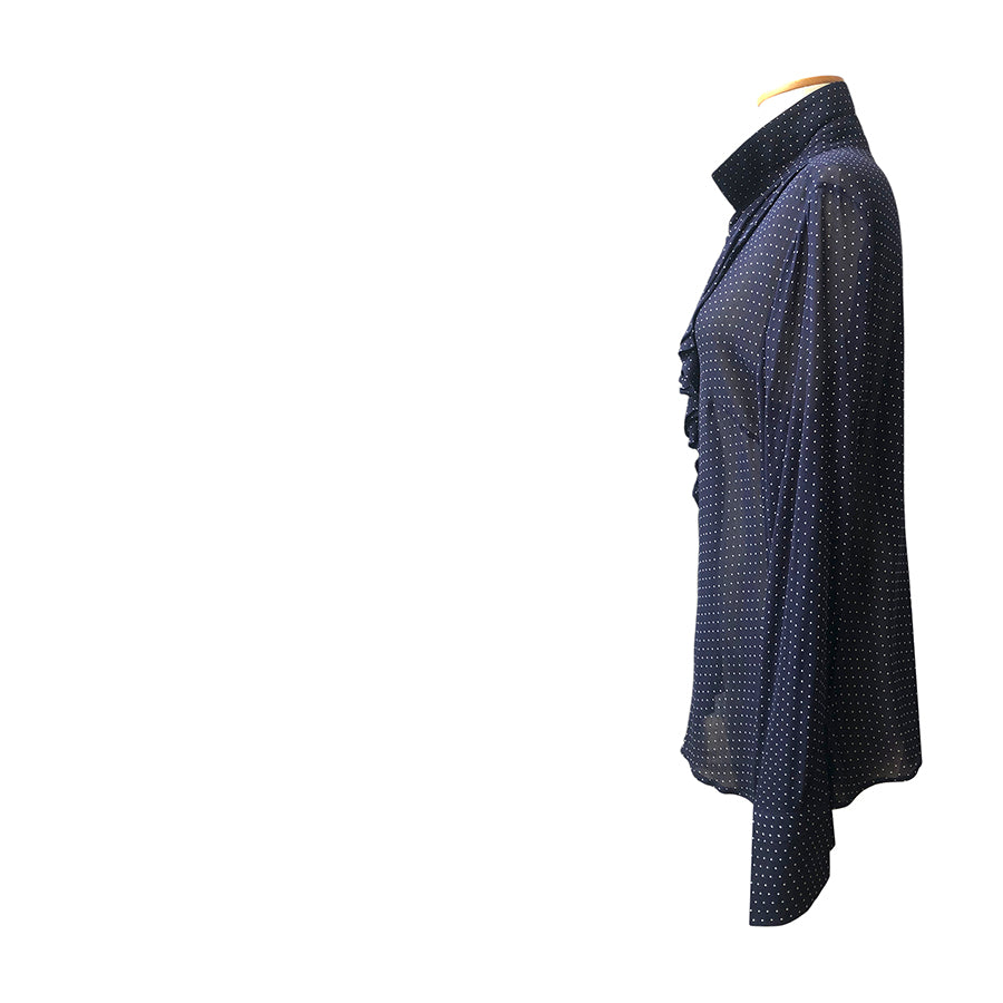 Camicia vintage anni ’80 in in chiffon semitrasparente blu navy con micro pois bianchi. Colletto classico con volant frontali, bottoni nascosti, vestibilità morbida e leggermente sfiancata.