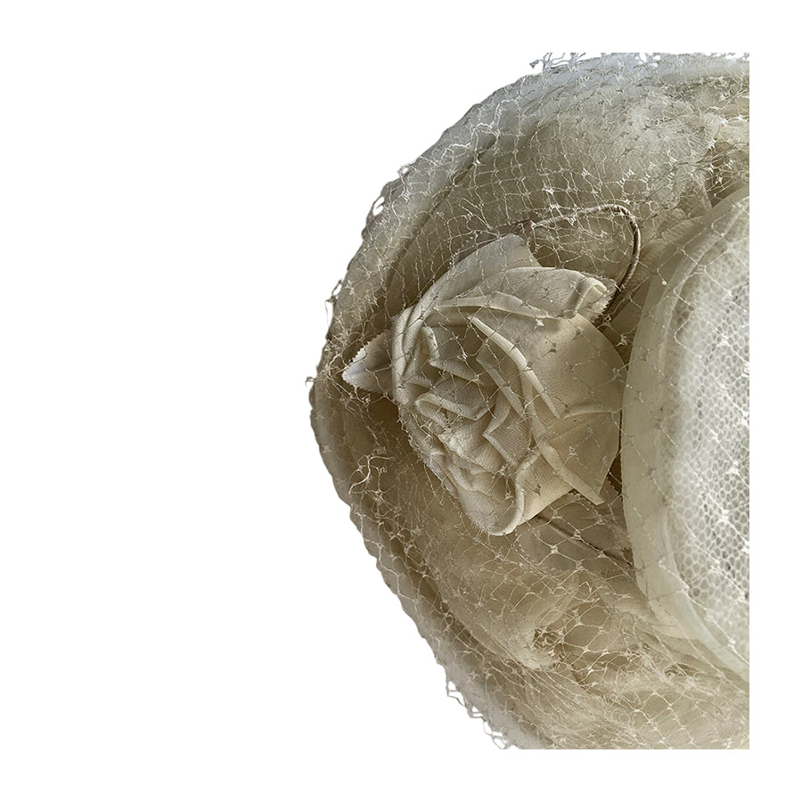 Cappello vintage da cerimonia a tesa larga in tonalità avorio, decorato con velo in rete e romantica rosa in tessuto tono su tono.