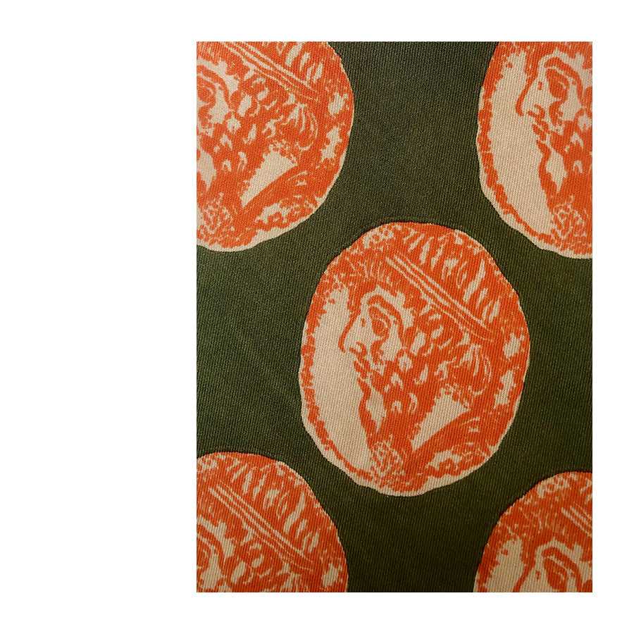 Colore: fondo oliva con motivo geometrico decorativo arancio