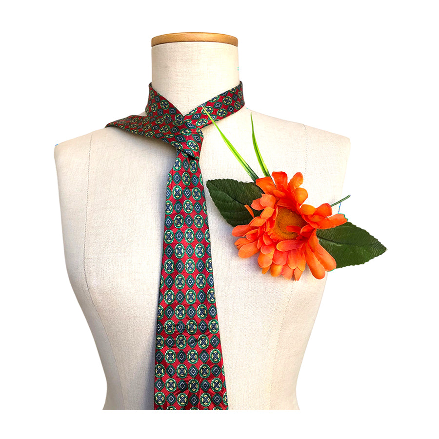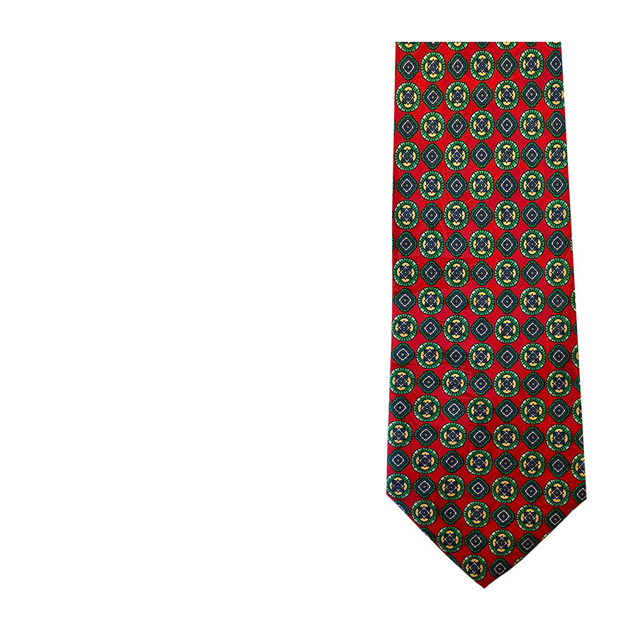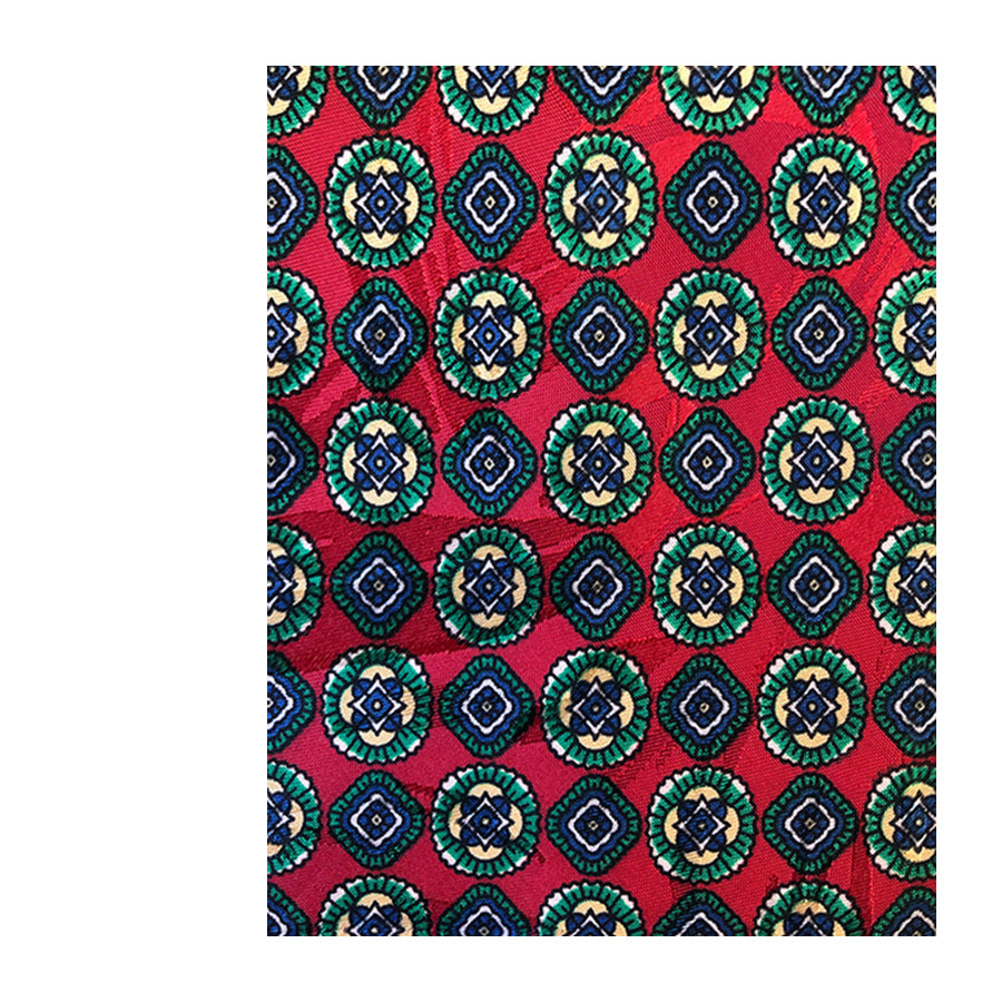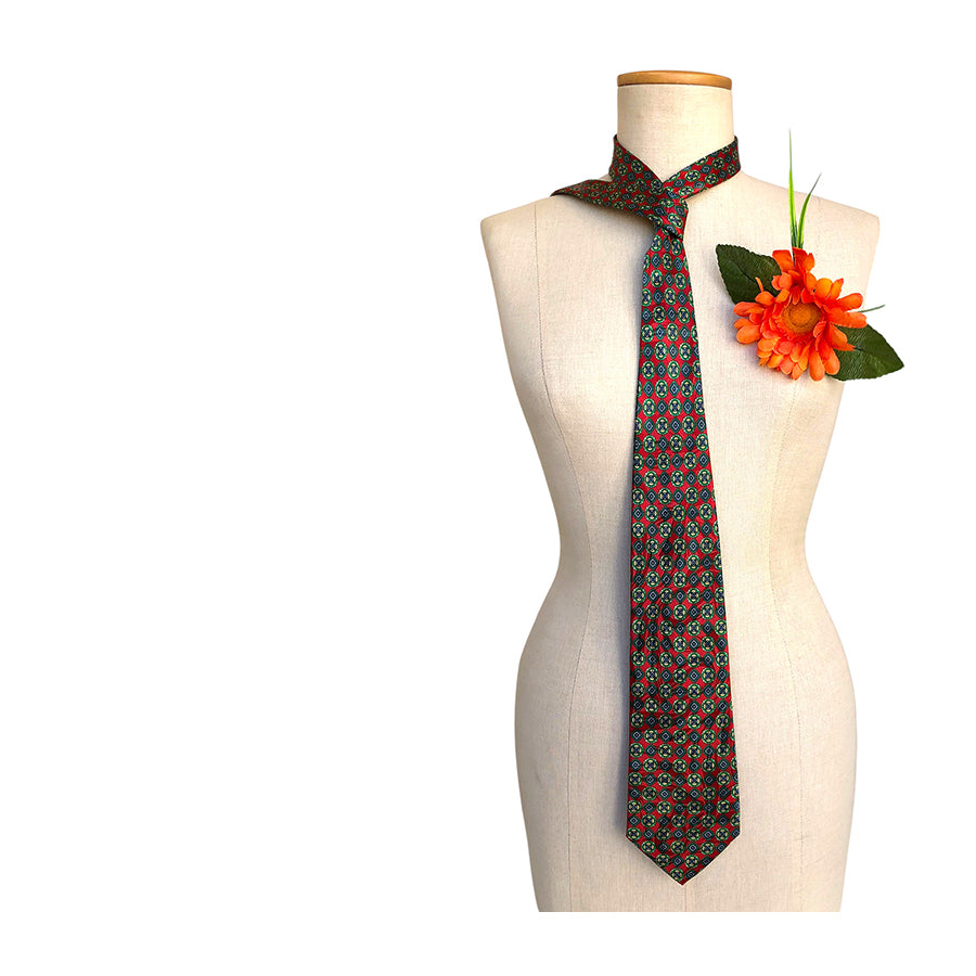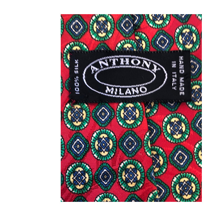 Raffinata cravatta vintage ‘80/’90 Antony Milano in seta. Il fondo rosso texturizzato è impreziosito da un motivo geometrico floreale nei toni blu, verde e avorio.