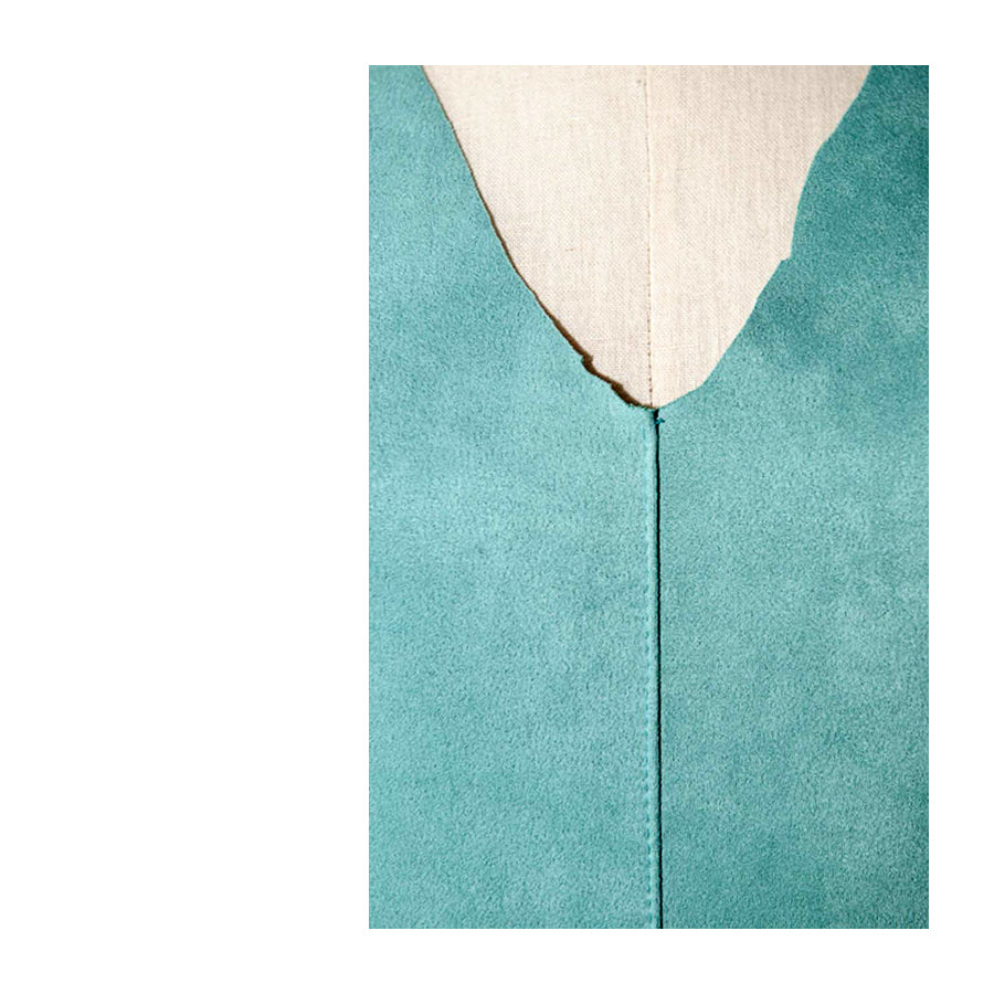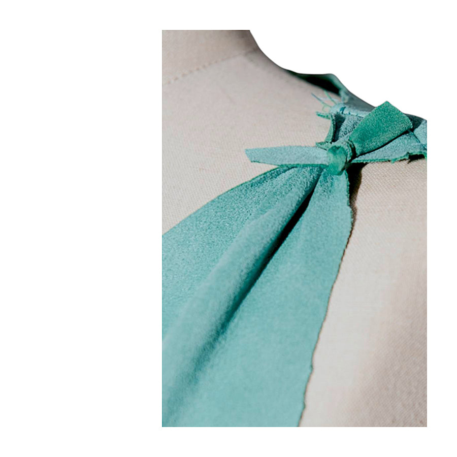 Fresco e minimal. Abito corto in viscosa ed elastan in tessuto effetto suede vede acqua, morbidissimo al tatto e con taglio al vivo. Taglio dritto, lunghezza mini, spalline sottili annodate a fiocco e scollo a cuore sagomato.