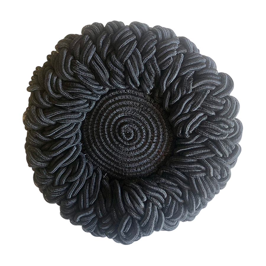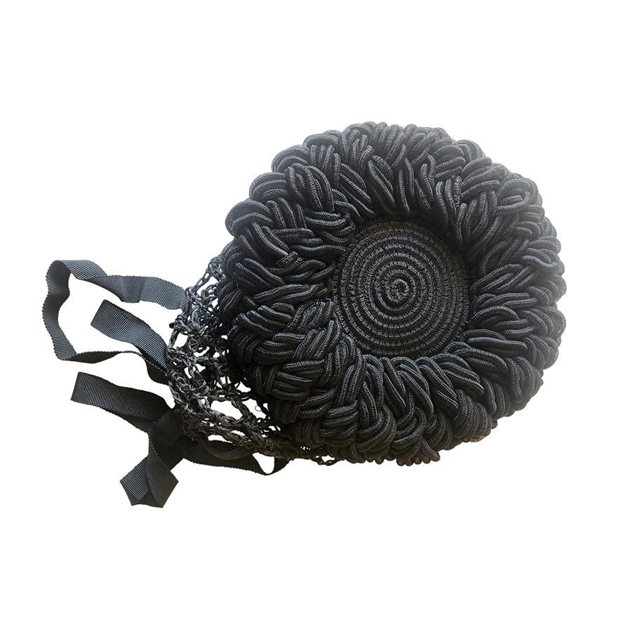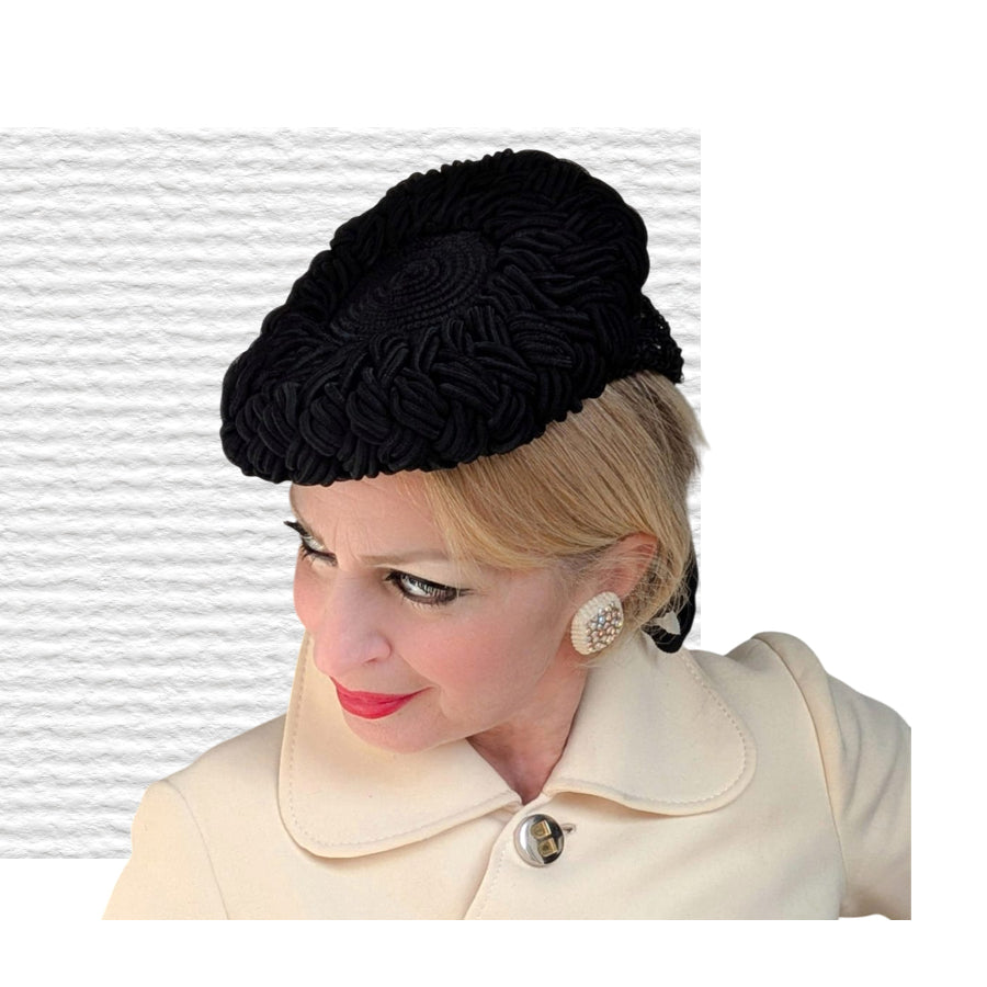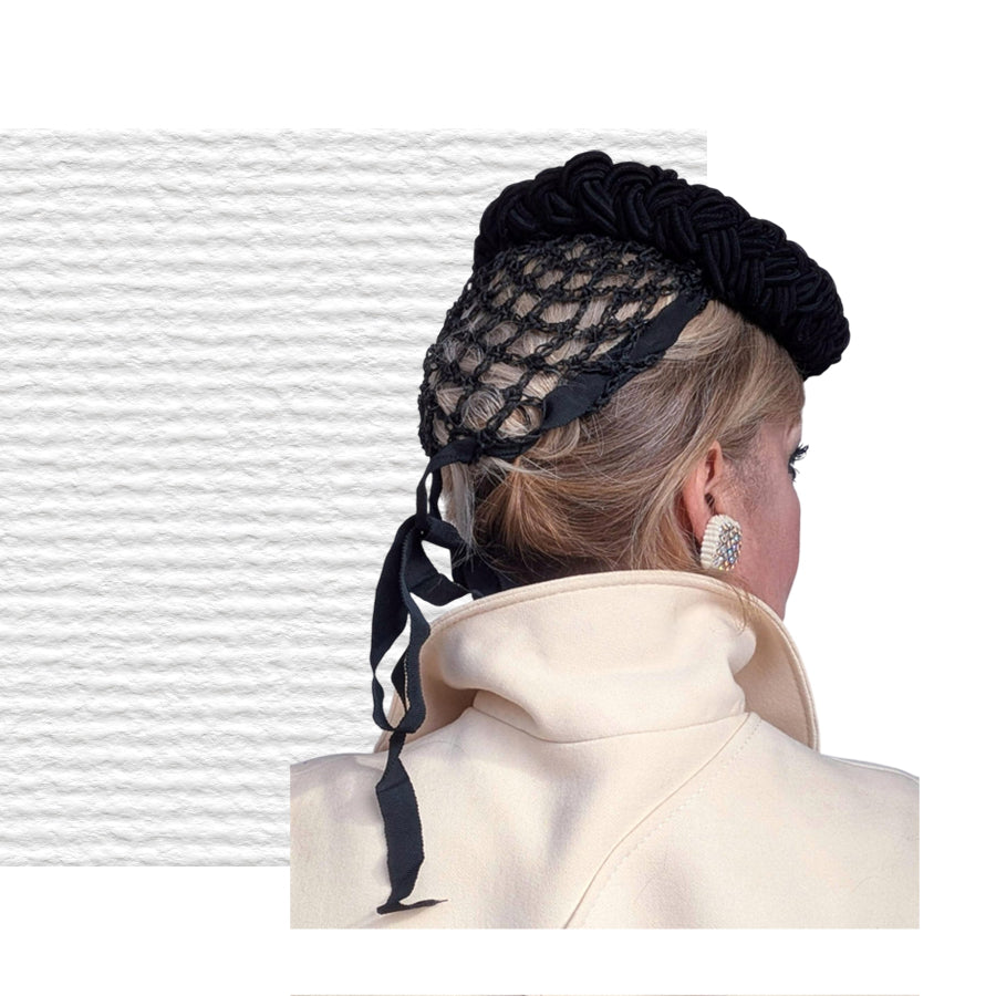 Pillbox vintage ’50 in cordonetto nero con lavorazione intrecciata e retina posteriore per raccogliere i capelli. La struttura compatta, i dettagli fatti a mano e il fiocco regolabile sul retro lo rendono un accessorio sofisticato e senza tempo.