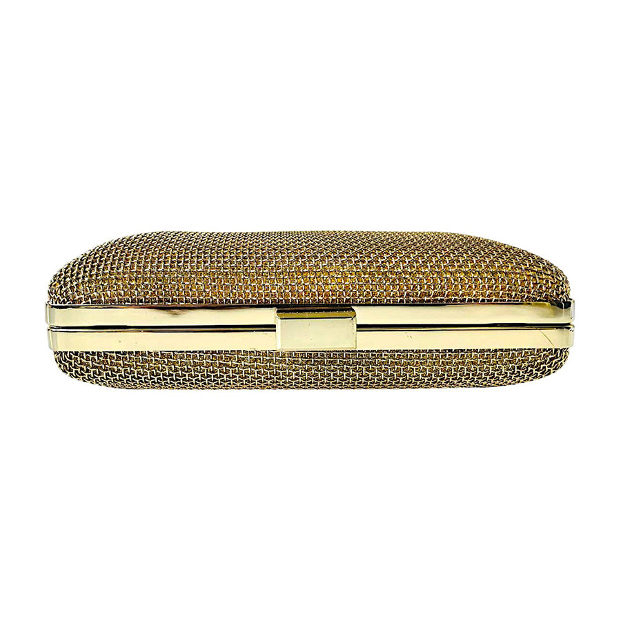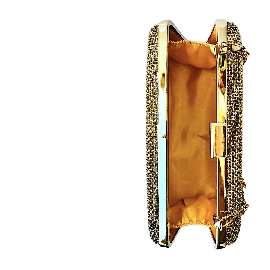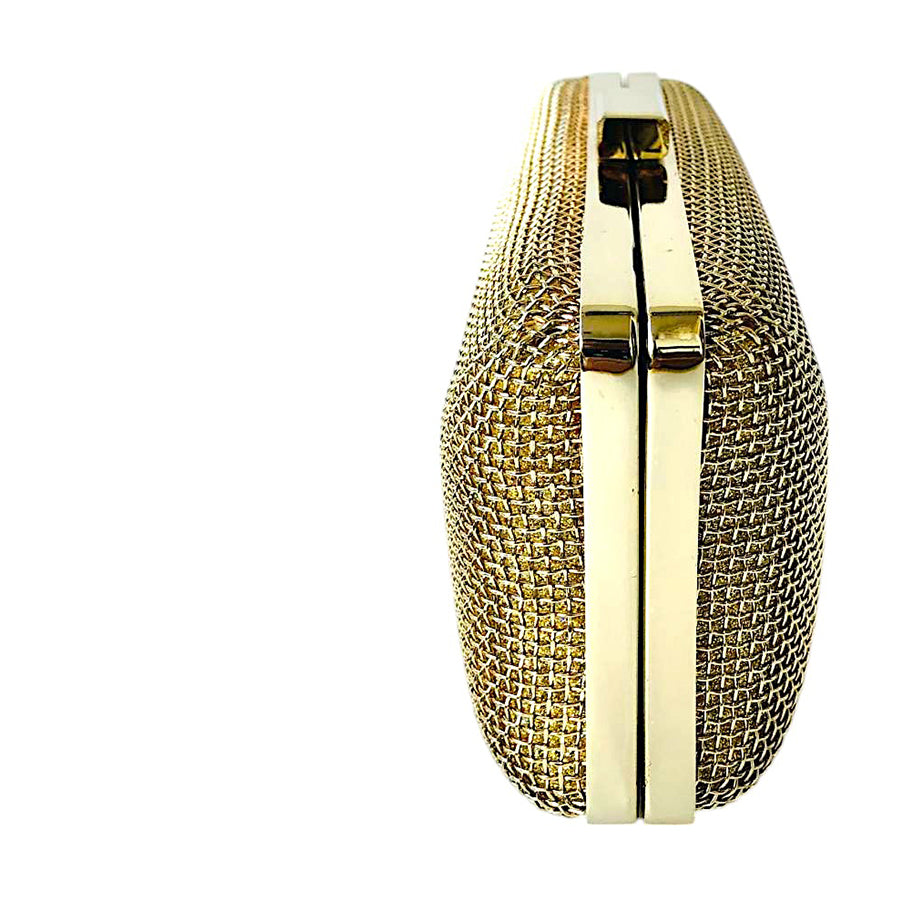 Pochette vintage dorata in maglia metallica con elegante chiusura a scatto e tracolla a catena dorata removibile. Glamour anni ’80.