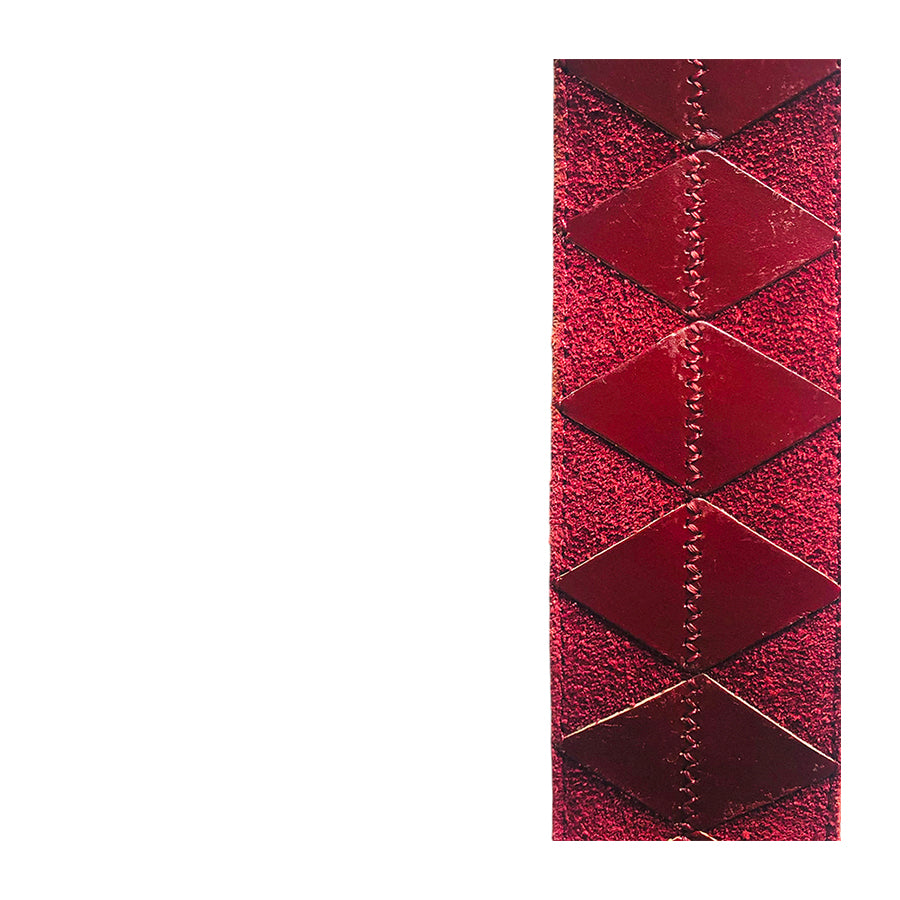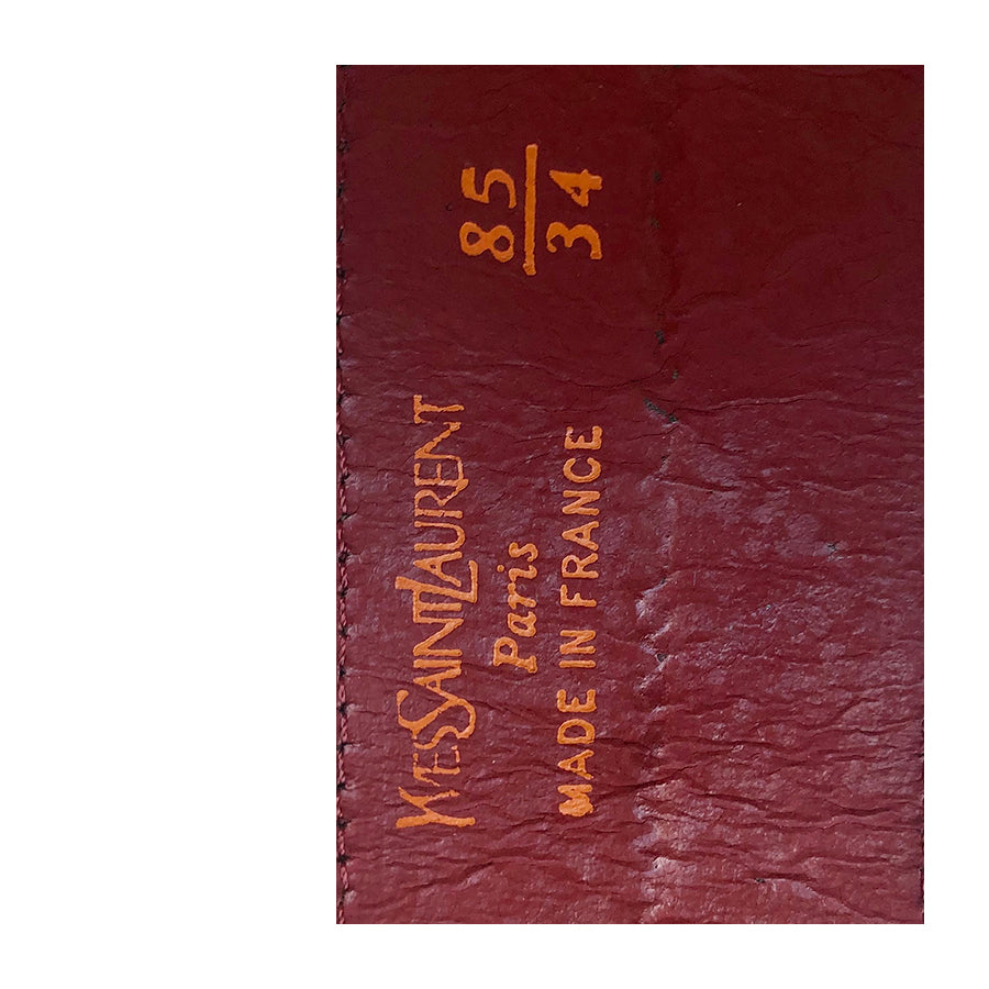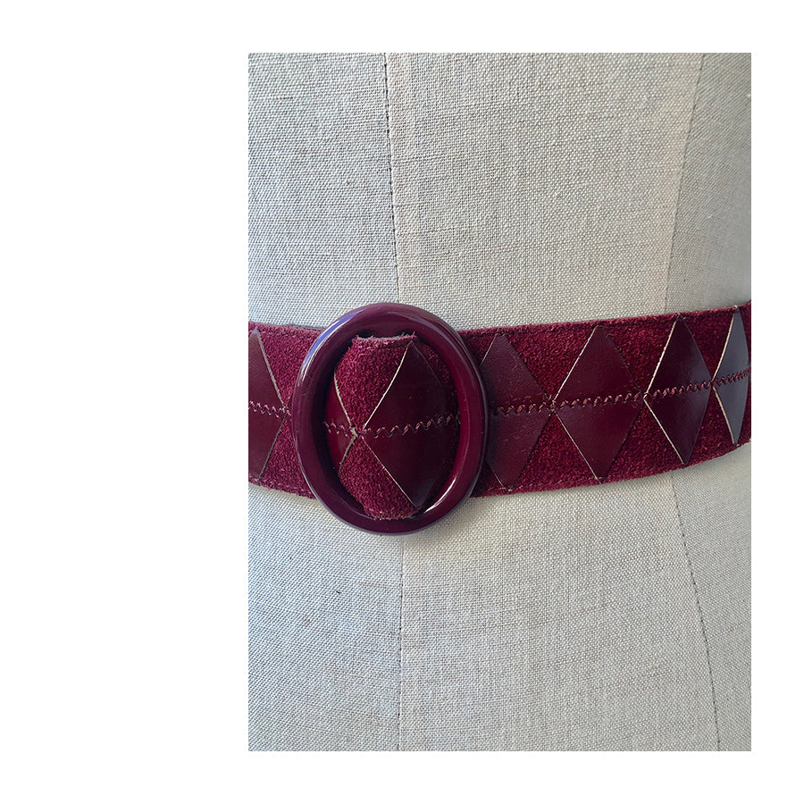 Iconica cintura vintage ’80 Yves Saint Laurent in suede e vernice burgundy. Il design a rombi crea un gioco di texture e lucentezze mentre la fibbia ovale tono su tono completa l’estetica tipicamente anni ’80 e dona carattere a qualsiasi outfit. Chiusura regolabile.